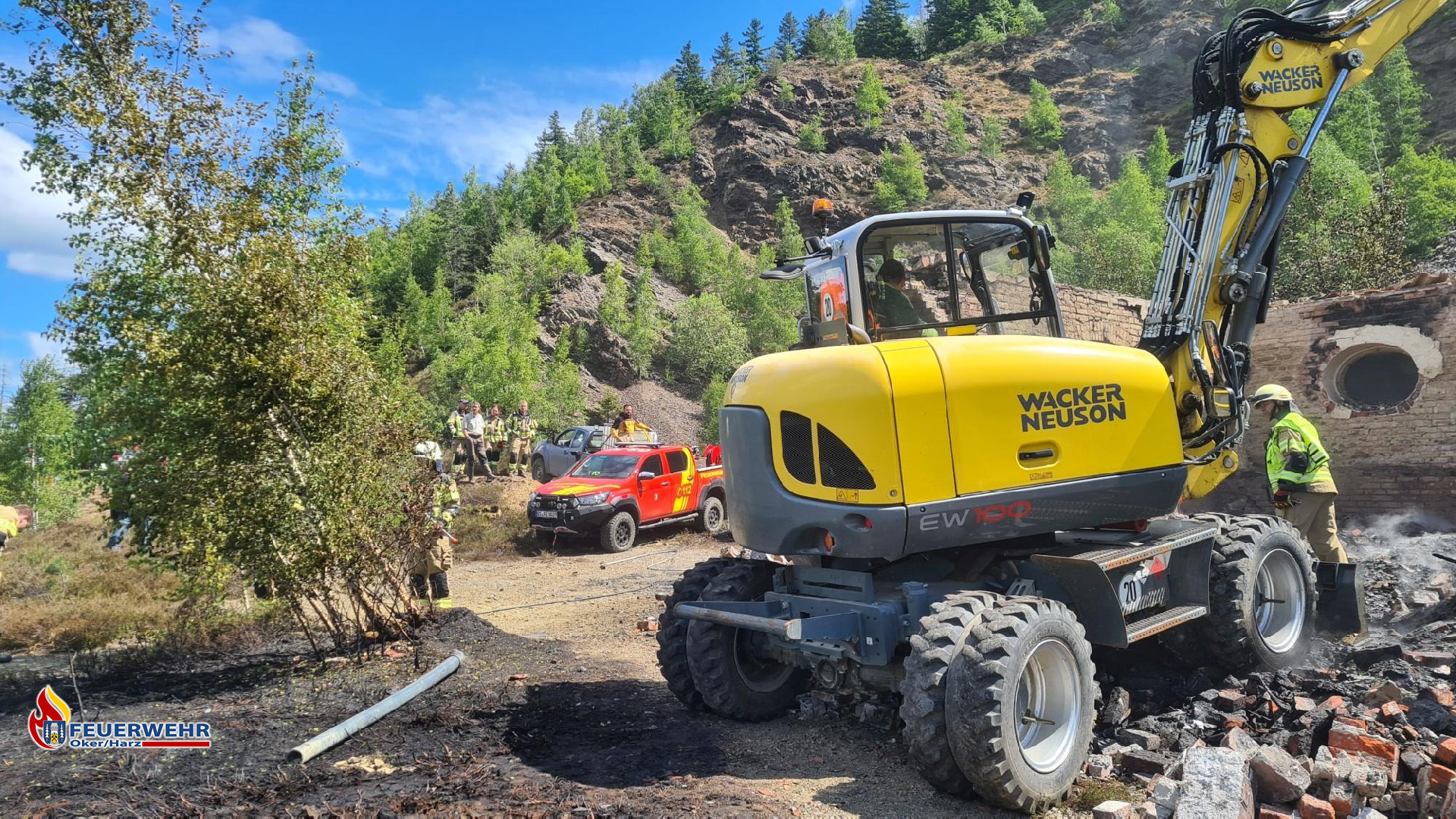 Im Bereitstellungsraum wurden zwei Kameraden der Feuerwehr Goslar aufgenommen, die aufgrund ihrer Ortskenntnis, die Zufahrt zur schwer erreichbaren Einsatzstelle ermöglichten. Vor Ort wurde umgehend mit ersten Löschmaßnahmen begonnen, insbesondere durch das Ablöschen der umliegenden Vegetation. Diese Maßnahmen waren erforderlich, da durch starke Hitzestrahlung und massiven Funkenflug, bereits angrenzende Bereiche Feuer gefangen hatten.
