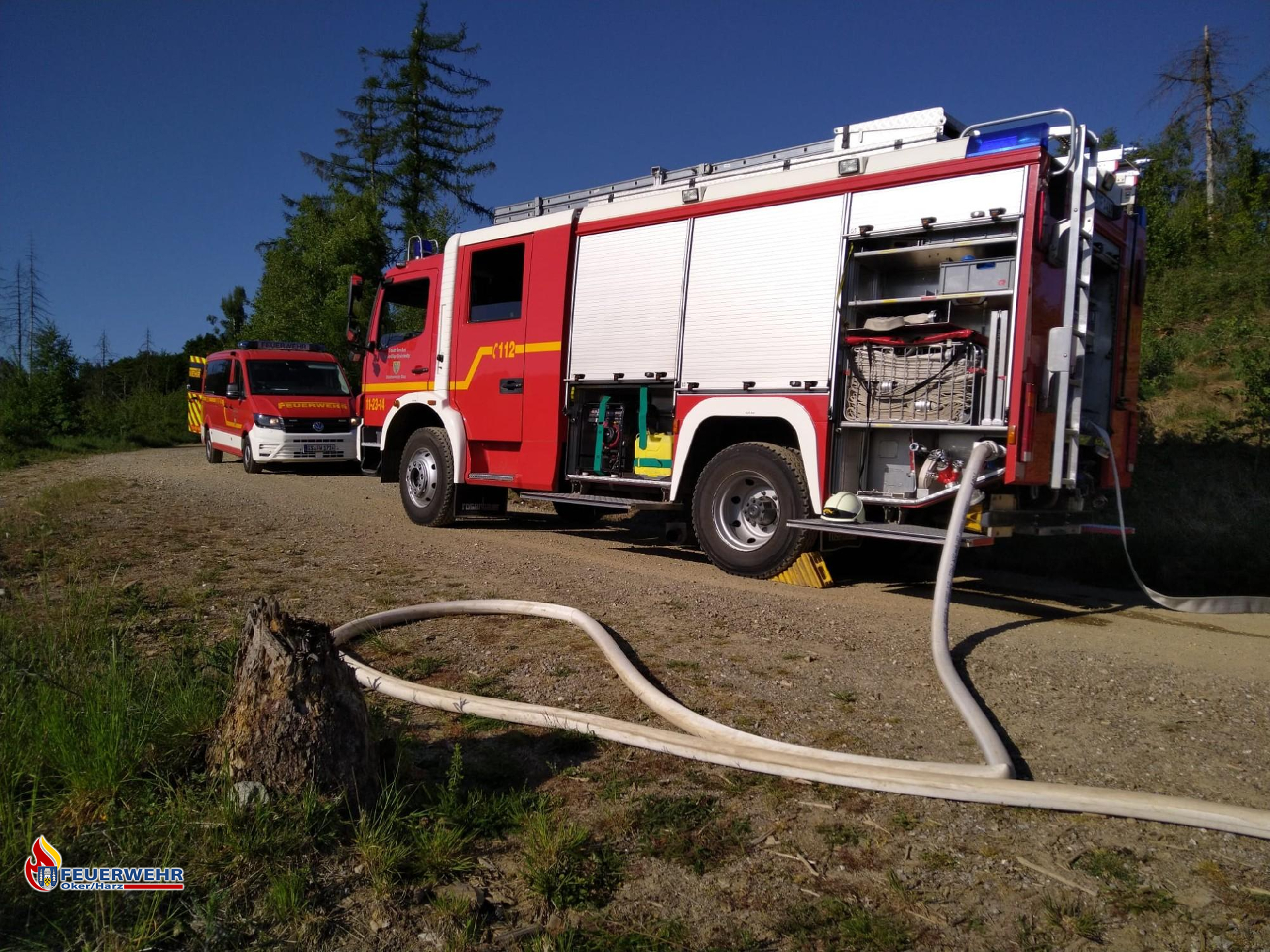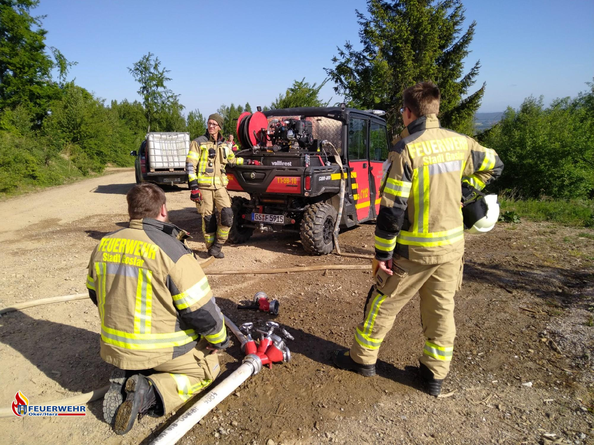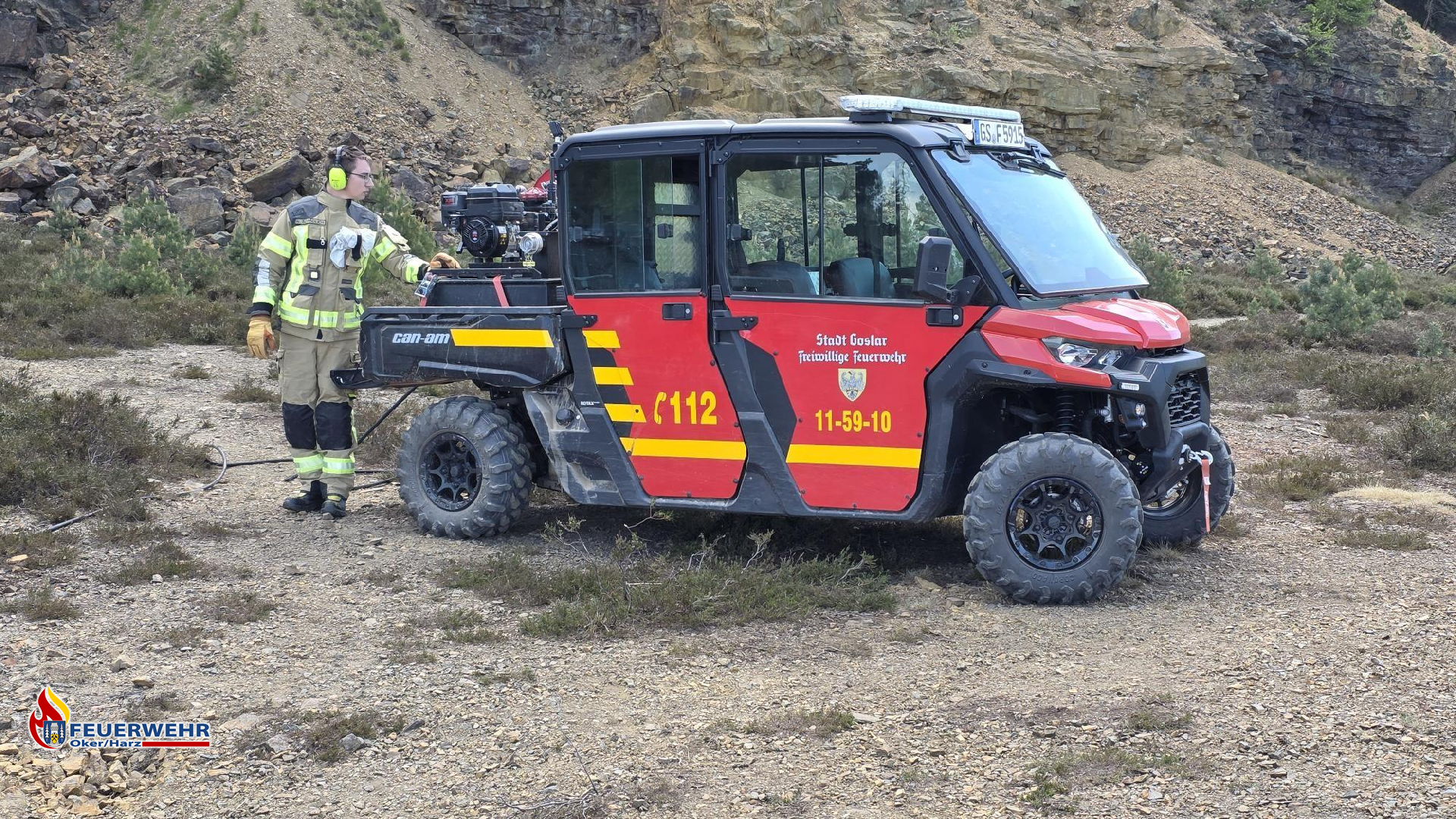 Nach dem Verbrauch der im Löschmodul mitgeführten Wassermenge, wurde eine Wasserentnahme beim etwa 1,3 Kilometer entfernten Tanklöschfahrzeug der Feuerwehr Goslar eingerichtet. Der Transport des Löschwassers ins unwegsame Gelände, erfolgte parallel durch unser UTV sowie durch den Pickup der Feuerwehr Sankt Andreasberg und das Waldbrandfahrzeug der Feuerwehrtechnischen Zentrale.