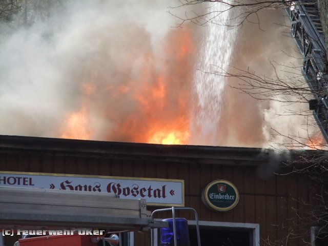 Um 06.08 Uhr wurde ein Rettungswagen, der gerade auf dem Weg von Clausthal-Zellerfeld nach Goslar war, von einem Autofahrer angehalten und auf eine starke Rauchentwicklung an der B241 aufmerksam gemacht und informierten die Feuerwehreinsatz- und Rettungsleitstelle. Die Kameraden aus Goslar waren gerade noch auf dem Rückweg einer ausgelösten Brandmeldeanlage in der Baßgeige, dadurch konnte innerhalb kurzer Zeit eine Lage- erkundung vorgenommen werden. Zu diesem Zeitpunkt drang dichter Qualm aus fast dem gesamten Gebäude des Restaurants und Hotels Haus Gosetal. Daraufhin wurden auch die Ortsfeuerwehren Oker und Hahnenklee-Bockswiese mit einer zweiten Drehleiter alarmiert.