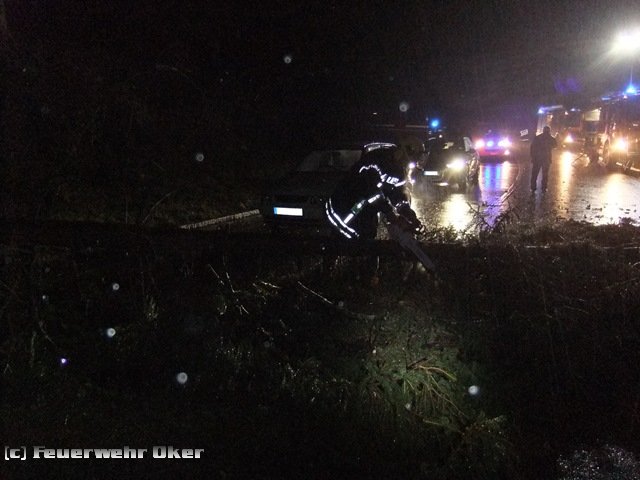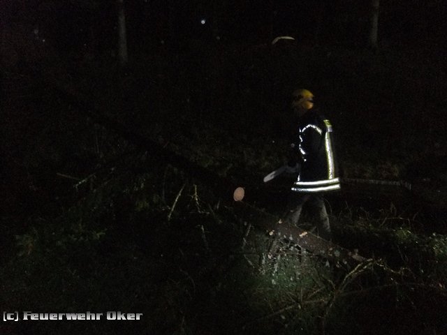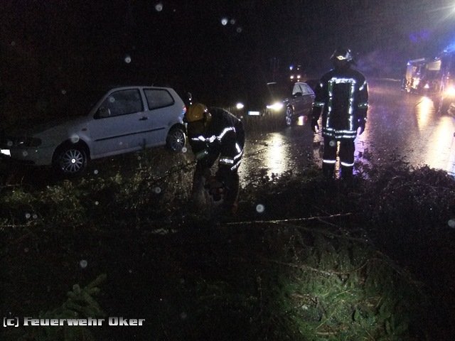 Ein Gewitter mit heftigem Hagelschauer und Sturmböen überzog die Gebäude und Straßen mit einer weißen Schicht. Nach einigen Minuten war der Spuk vorbei. Ein Baum jedoch hielt den Böen nicht stand und fiel im Okertal in Höhe Romkerhalle quer über die B 498. Ein PKW wurde dabei leicht beschädigt. Personen wurden nicht verletzt. Um 22.18 Uhr wurde die Feuerwehr Oker alarmiert. Nach Absperrung und Ausleuchtung der Einsatzstelle konnte der entwurzelte Baum bis 1 m zur Straßenkante stückweise zersägt und die Fahrbahn freigeräumt werden. Die Einsatzstelle wurde der Polizei übergeben, die kurz darauf die Strecke wieder frei gab.