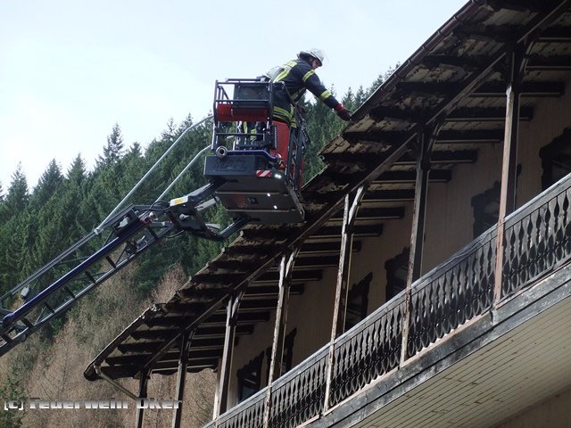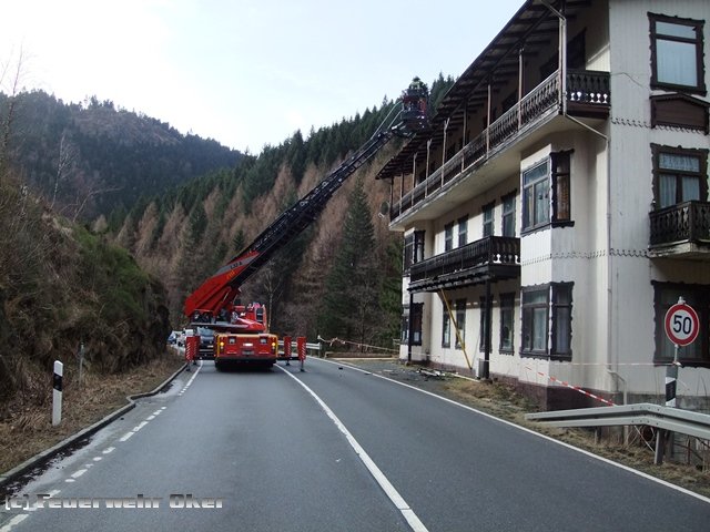 Heftige Sturmböen fegten auch über das Okertal hinweg. An einem Gebäude in der Nähe von Romkerhalle hatte der Wind morsches Dachmaterial auf die Straße geweht. Da noch mehr herunterzufallen drohte, wurde von der Polizei die zuständige Ortsfeuerwehr Oker und die Drehleiter der Ortsfeuerwehr Goslar alarmiert. Nach einer Vollsperrung der B 498 wurden Teile der losen Dachrinne und weiteres Dachmaterial kontrolliert zu Boden gebracht und die Gefahr beseitigt.