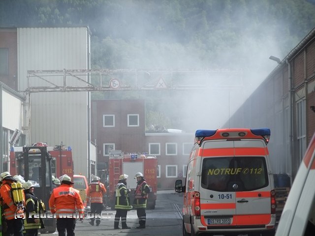 „Metallbrand in einem Recyclingbetrieb“ lautete die erste Alarmierung für die Ortsfeuerwehren aus Oker und Goslar. Kurz nach dem Eintreffen wurde deutlich, dass weitere Einsatzkräfte benötigt werden. Die Feuerwehren Goslar und Oker wurden ein zweites Mal alarmiert. In Oker heulten sogar die Sirenen, um auch Kameraden ohne "Pieper" zu erreichen. In einer Industriehalle waren Metallspäne in Brand geraten. Rauch und enorme Hitze breiteten sich schnell in der gesamten Halle aus und sorgte für eine absolute Nullsicht. Unter schwerem Atemschutz retteten Einsatzkräfte aus Oker und Goslar eine Schwerstverbrannte Person, sowie drei weitere Mitarbeiter aus der verqualmten Halle.