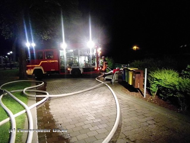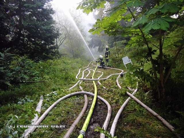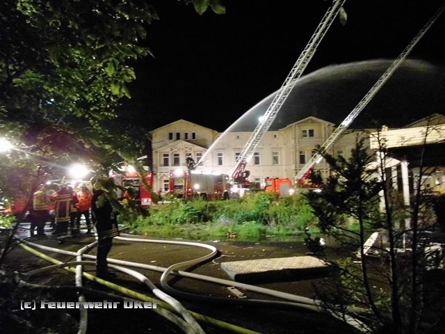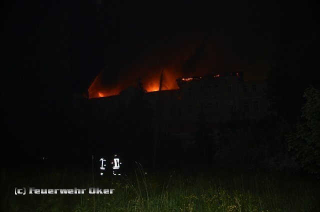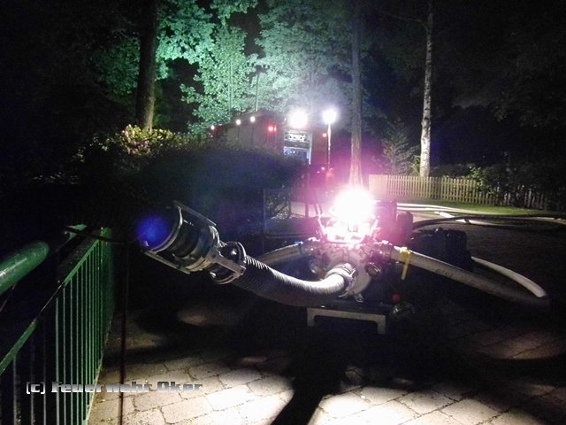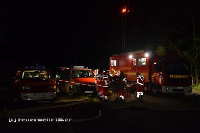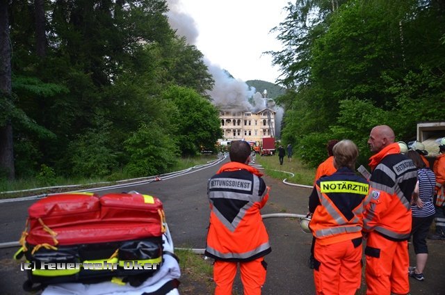 Um 20.53 Uhr wurde auch die Feuerwehr Oker zur Einsatzstelle alarmiert. Am Teich im Kurpark Bad Harzburg wurde mit der tragbaren Pumpe (PFPN) eine Wasserentnahmstelle eingerichtet. Die Radau musste für die Löschwasserentnahme angestaut werden. Über 800m B-Druckschläuche verlegten die Einsatzkräfte der Feuerwehr Oker aufgeteilt auf zwei parallele Wasserförderleitungen zur Gebäuderückseite und speisten dort zwei Wasserwerfer ein. Das Tanklöschfahrzeug wurde aus dem Einsatz heraus gehalten und stand als Bereitschaft für Einsätze in der Stadt Bad Harzburg bis 7 Uhr am Folgetag bereit. Ein Einsatz war zum Glück aber nicht erforderlich.