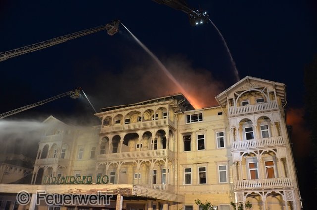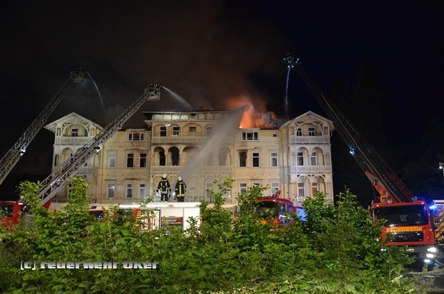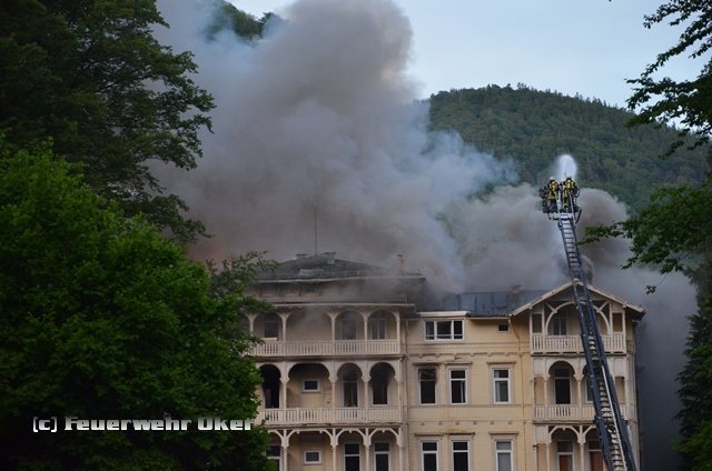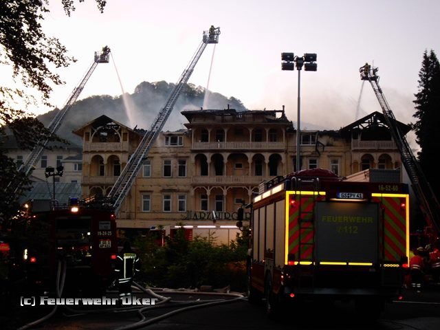 Gegen 19.15 Uhr geriet das leerstehende Hotel "Harzburger Hof" in Brand. Eine dunkle Rauchwolke stieg über das Brandobjekt in Richtung Himmel. Gleich mehrere Anrufer meldeten das Feuer. Die Leitstelle löste zuerst Alarm für die Feuerwehren Harlingerode und Bad Harzburg aus. Bereits auf Anfahrt ließ der Einsatzleiter Sirenenalarm für beide Feuerwehren auslösen. Nach einer kurzen Lageerkundung wurden zwei weitere Löschzüge mit Drehleitern aus Goslar und Braunlage angefordert. Anschließend folgte der Alarm aller Feuerwehren der Stadt Bad Harzburg. Es galt eine Wasserförderung über ca. 1000m Länge aufzubauen, da es in der Nähe des Brandobjekts keine geeignete Wasserentnahmestelle gibt. Insgesamt wurden im Laufe des Abends ca. 8000m Schläuche verlegt.