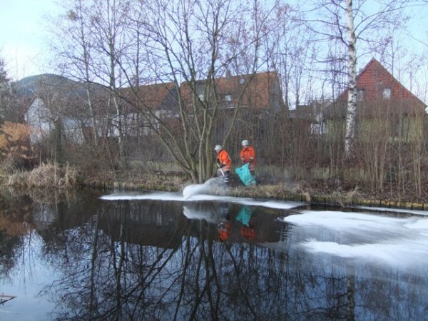 Mitarbeiter der Stadt Goslar, Abteilung Straßen und Grün, entdeckten in einem Teich an dem Fluss Oker in Höhe der Straße Wehrdamm einen Kunststoffkanister. Beim Versuch diesen zu bergen, trat eine ölige Flüssigkeit aus und verbreitete sich auf der Wasseroberfläche. Die daraufhin gegen 9.30 Uhr alarmierte Freiwillige Ortsfeuerwehr Oker streute mit Ölbindemitteln das Gewässer ab. Die mitalarmierte Ortsfeuerwehr Goslar unterstützte mit Ölbindematerial, konnte aber nach kurzer Zeit wieder einrücken. Der Verursacher ist unbekannt, die Polizei nahm die Ermittlungen auf. Eine Spezialfirma nahm das Gemisch zur Entsorgung wieder auf. Einsatzende für die 13 Feuerwehrleute war gegen 10.30 Uhr.