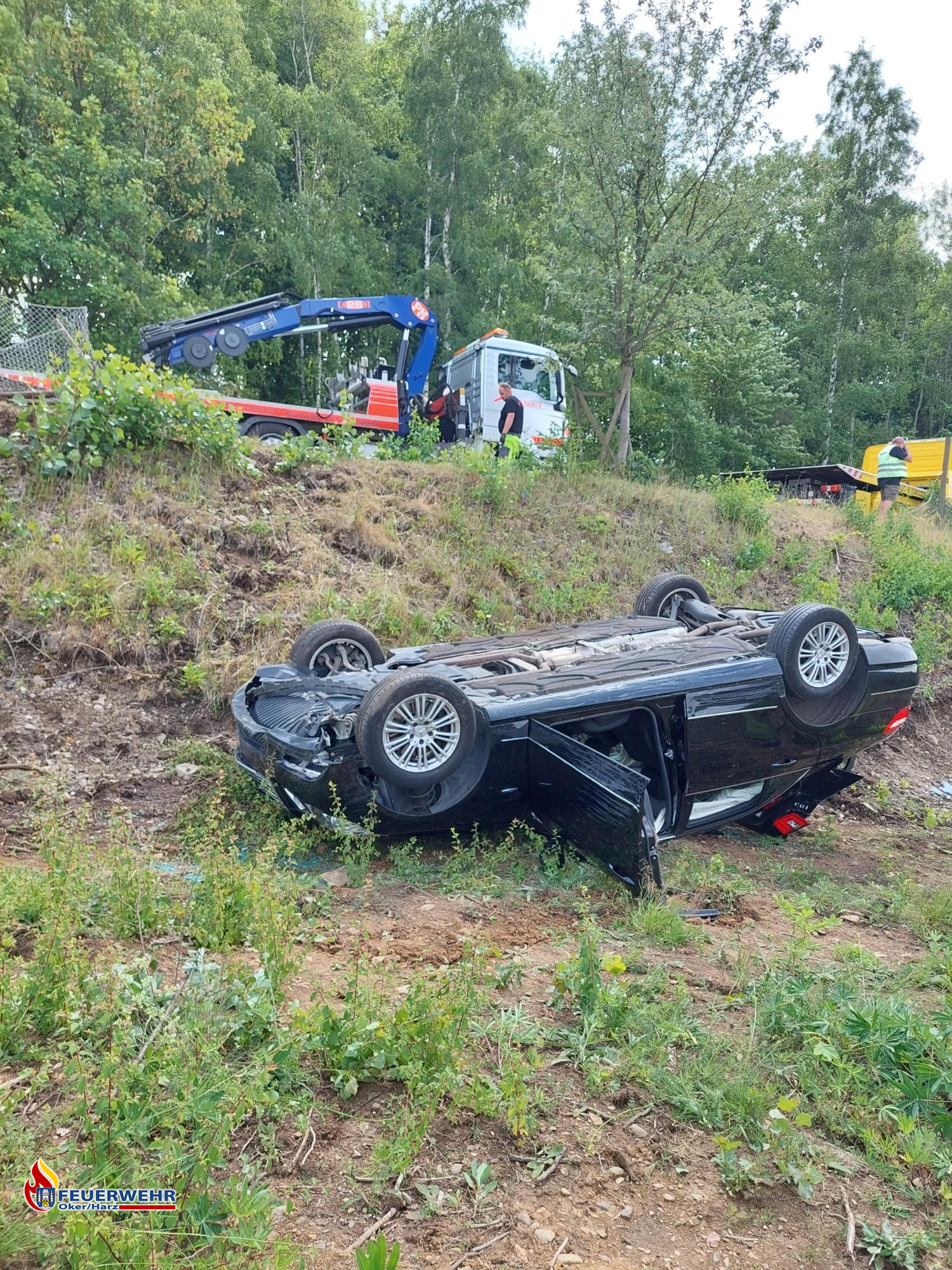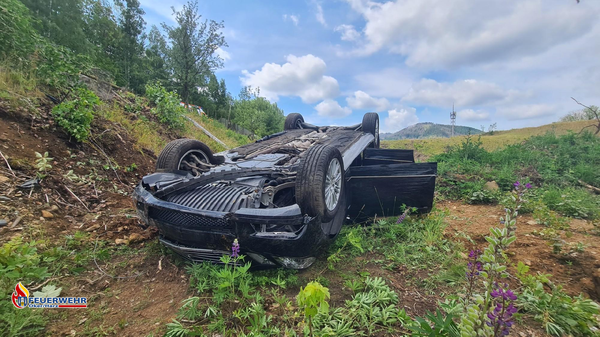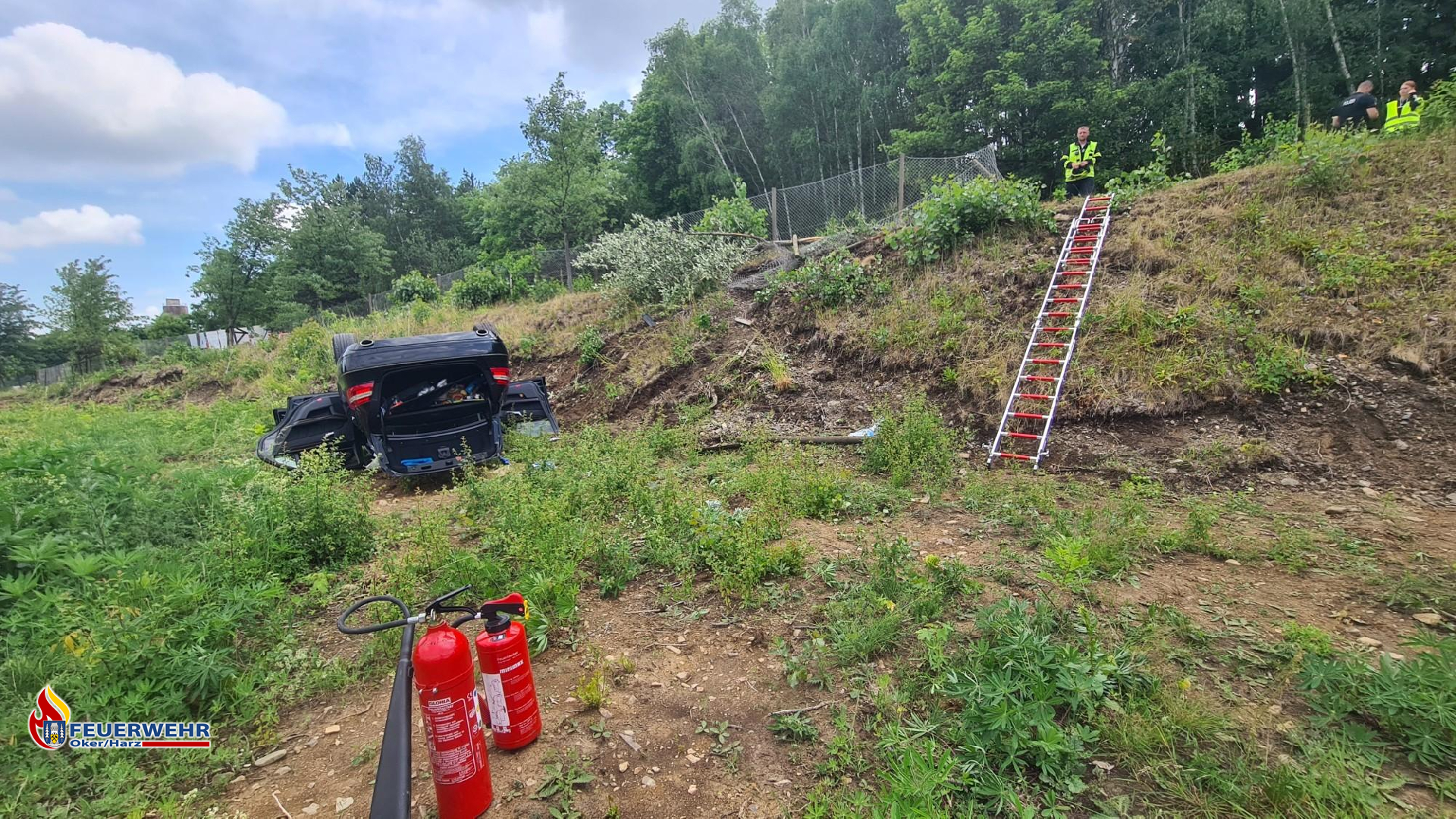 An der Einsatzstelle angekommen, sah unser Ortsbrandmeister Florian Rowold das Ausmaß des Unfalls. Das Fahrzeug ist einen fünf Meter tiefen Hang hinuntergestürzt, überschlug sich und blieb auf dem Dach liegen. Einige Ersthelfer kümmerten sich bereits um die verletzte Person, bis der Rettungsdienst eintraf. Wir stellten den Brandschutz sicher und befreiten schonend den Patienten mithilfe der Feuerwehr Goslar und dem Rettungsdienst.