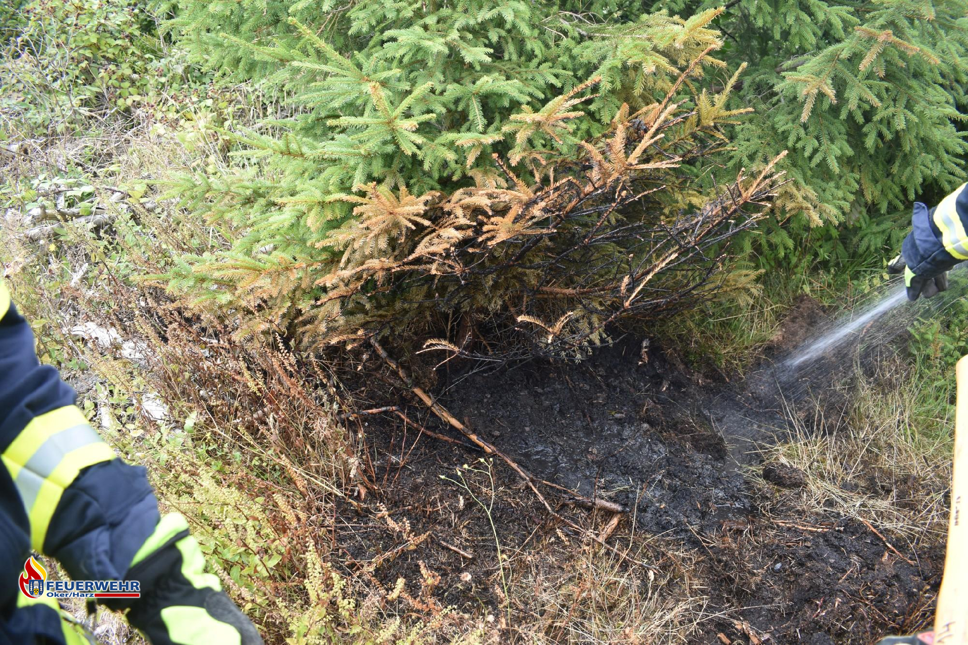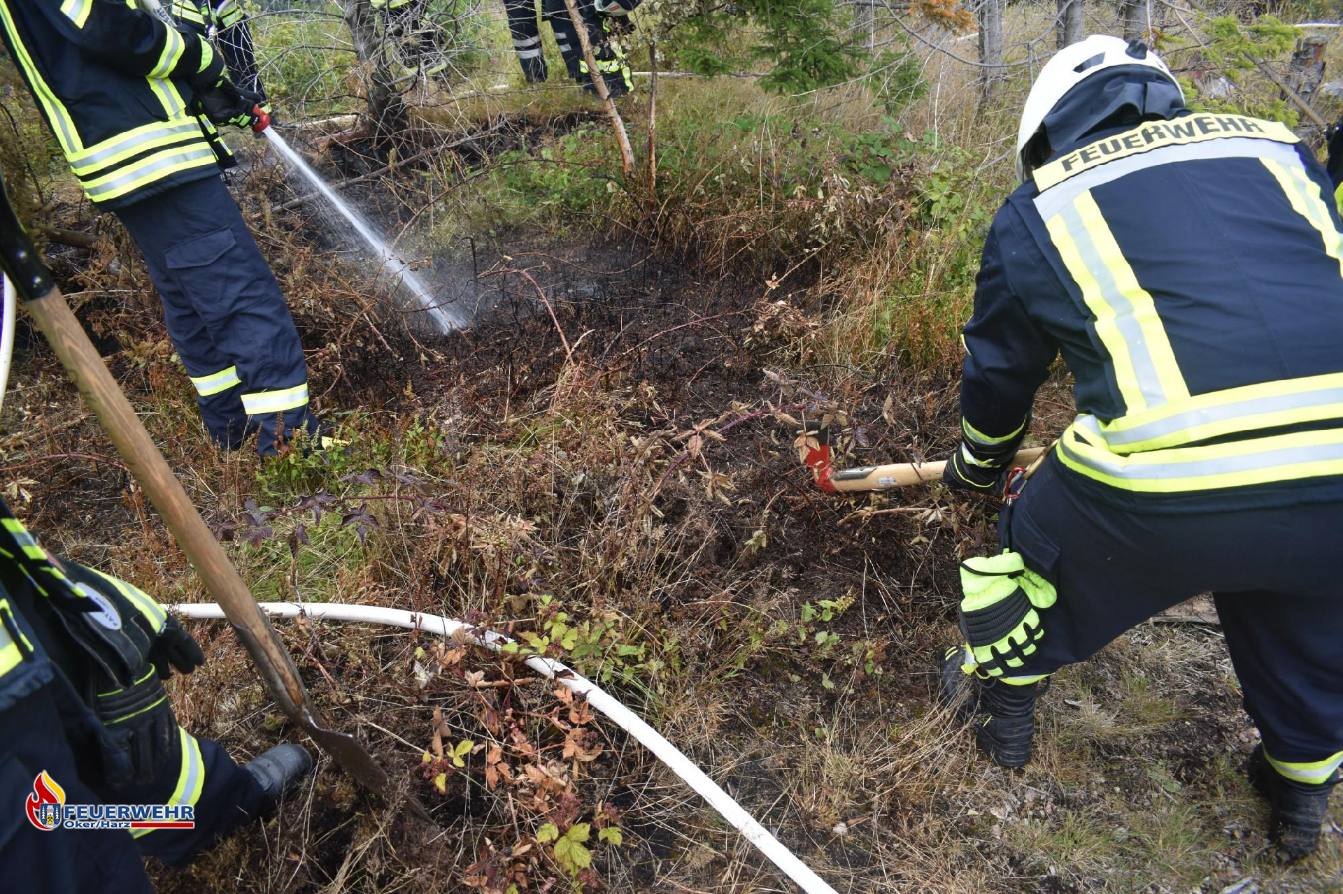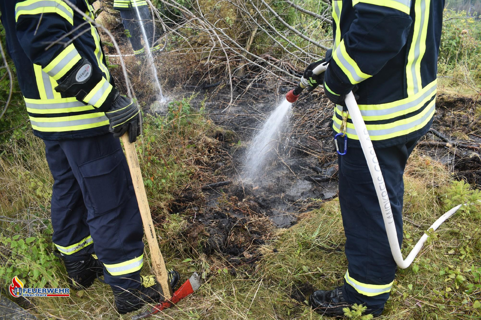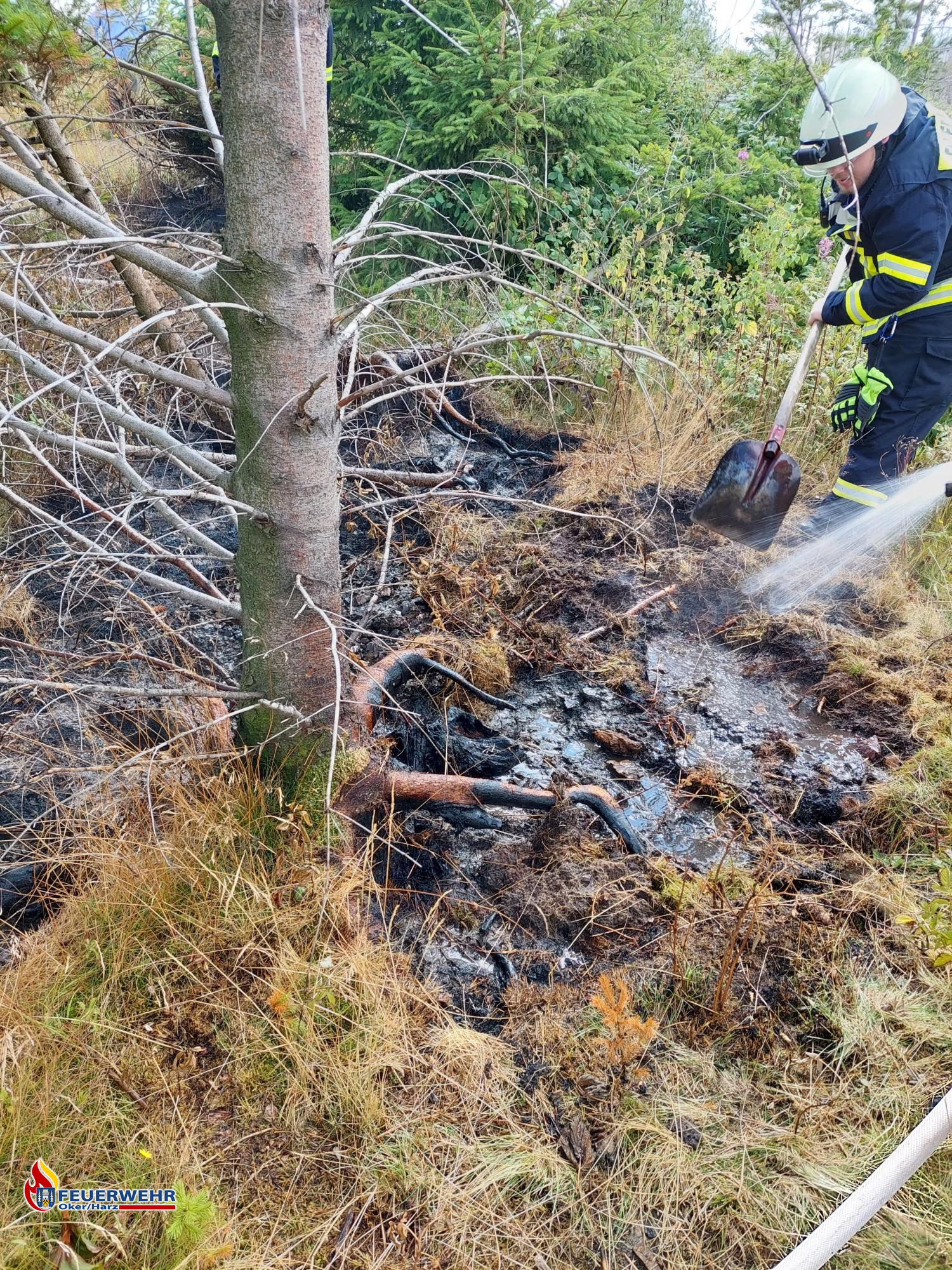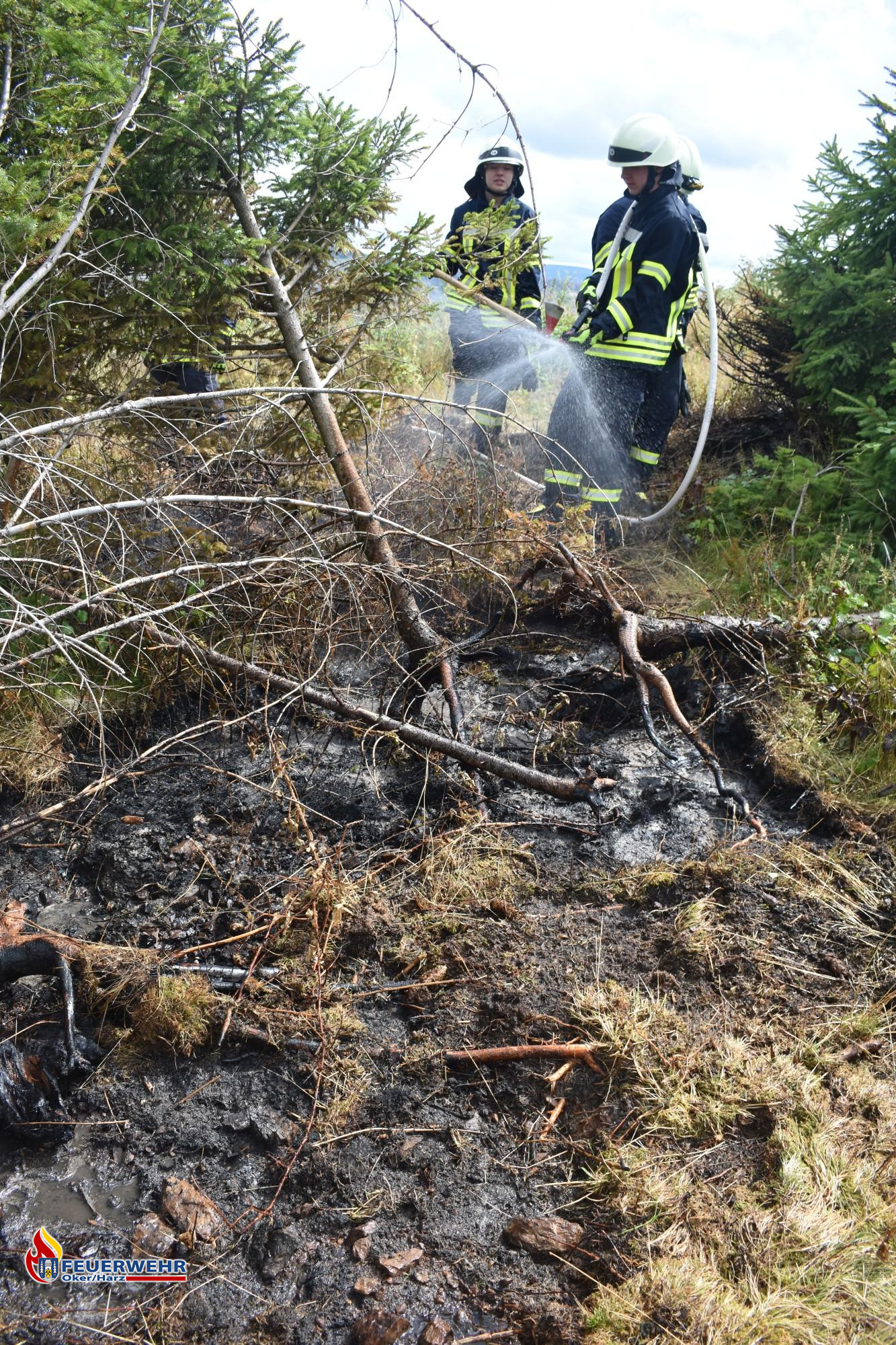 Dort angekommen, fingen die Einsatzkräfte an, den verbrannten Waldboden mit Handwerkzeug, wie zum Beispiel Äxten und Spaten, aufzuwühlen und diesen mit reichlich Wasser abzukühlen.