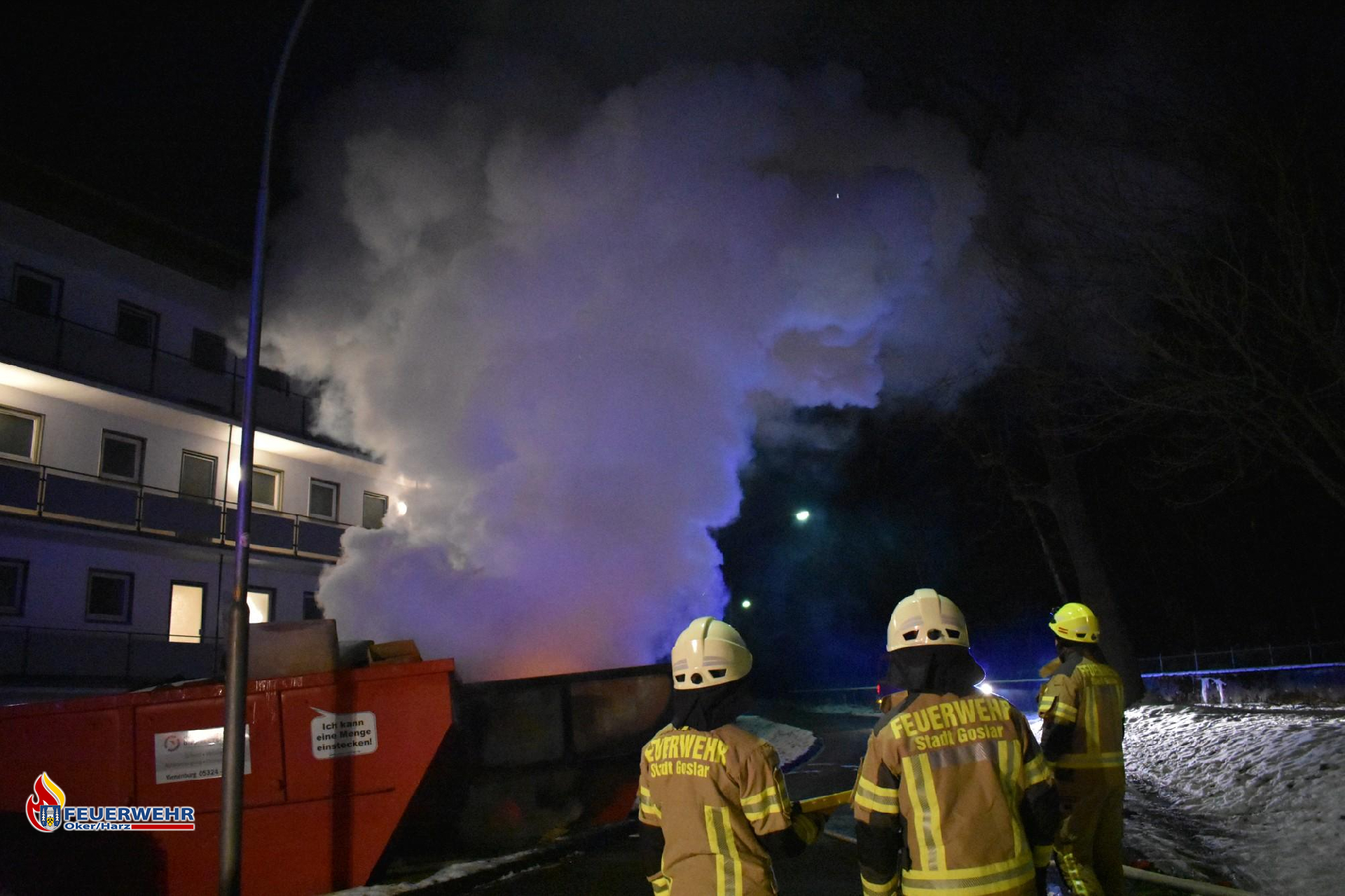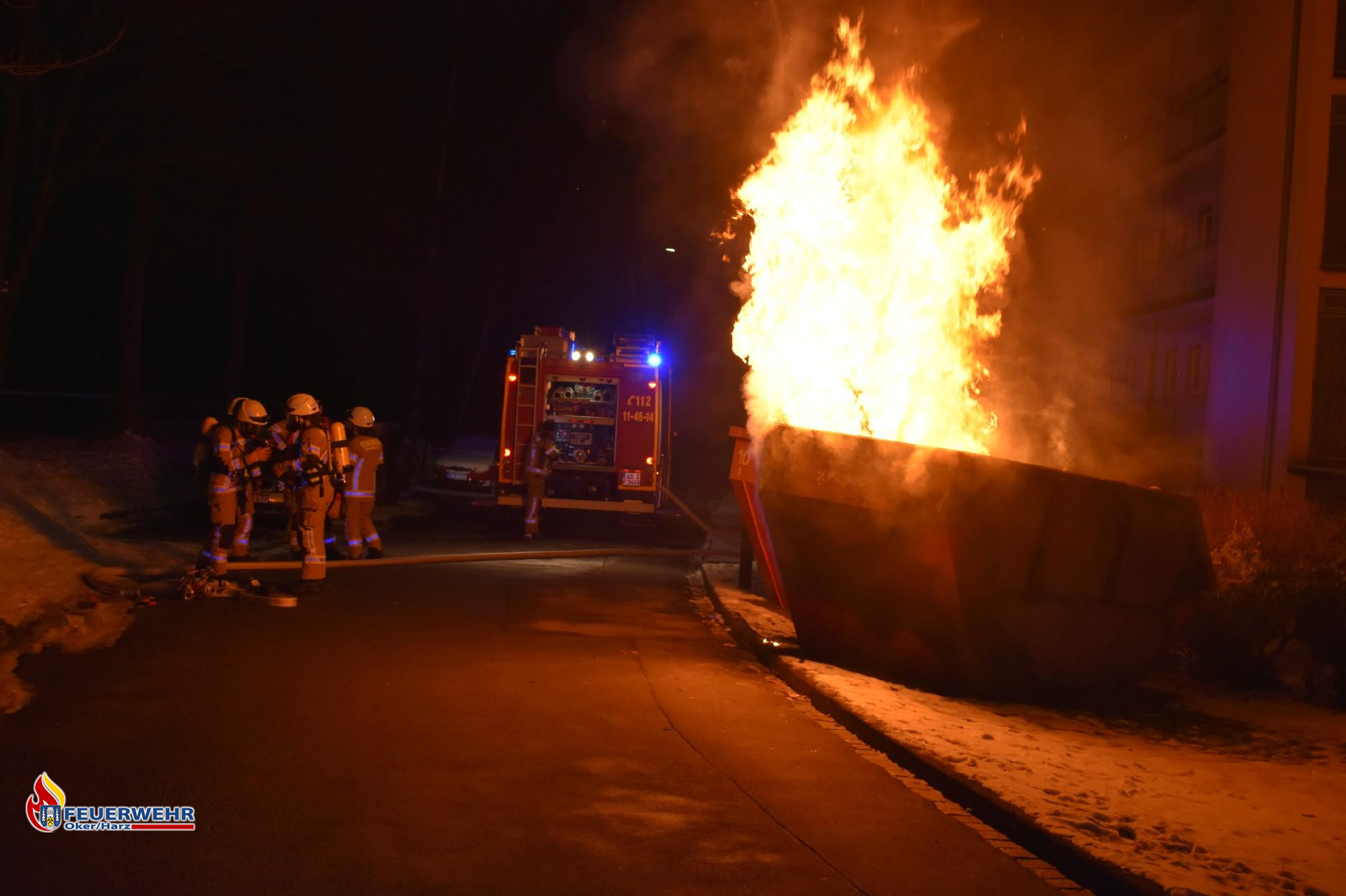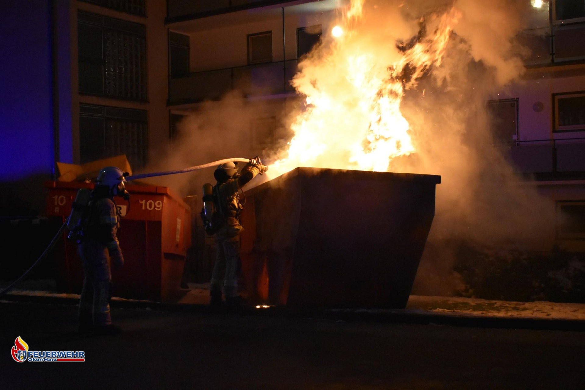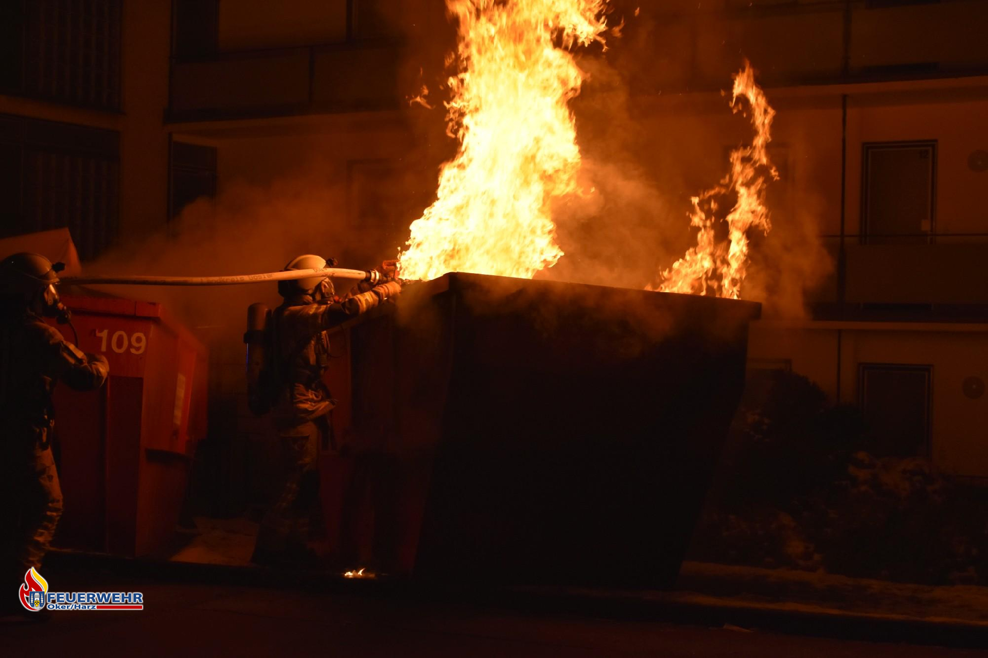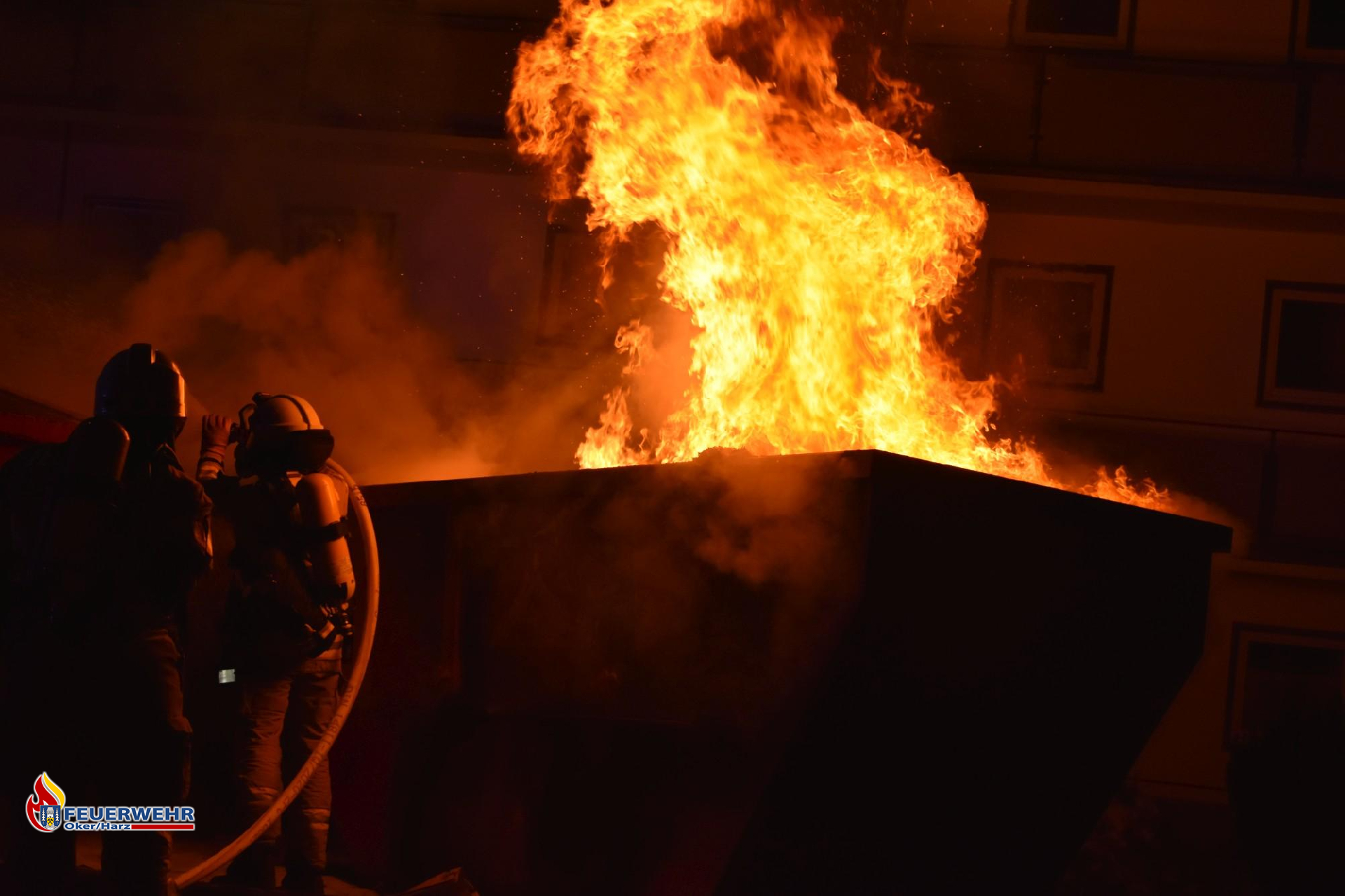 Bereits auf der Anfahrt rüstete sich der Angriffstrupp mit schwerem Atemschutz aus und ging nach dem Eintreffen sofort mit einem C-Strahlrohr zur Brandbekämpfung vor. Vorrangig wurde der benachbarte Container gekühlt, da er durch die starke Hitze bereits Rauch entwickelte.
