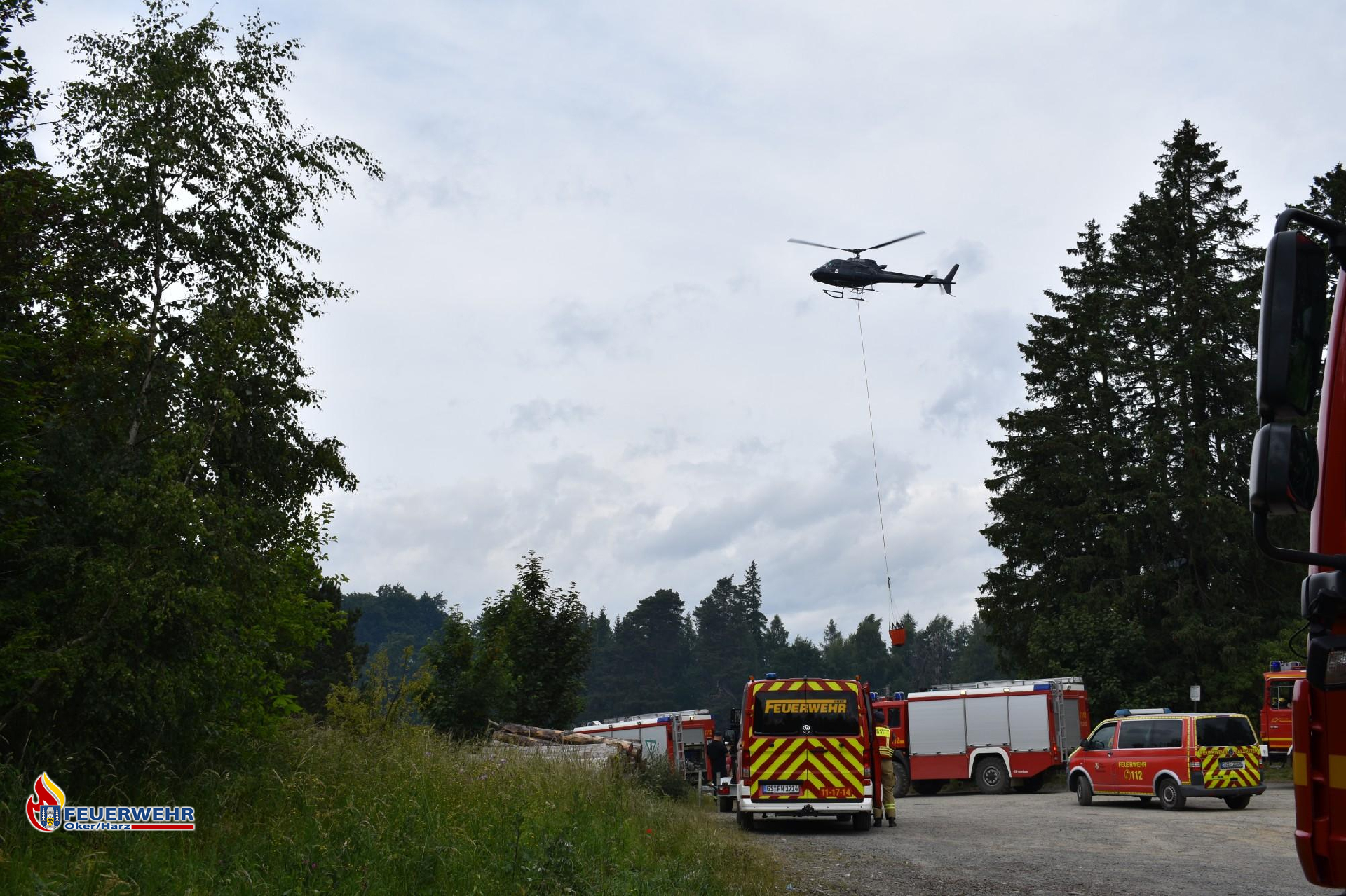 Dort stellte das Löschgruppenfahrzeug weiterhin den Brandschutz für den Helikopter sicher. Das Tanklöschfahrzeug blieb im Ringverkehr aktiv. Unser Mannschaftstransportwagen übernahm die Abschnittsleitung im oberen Einsatzbereich, weitere Kräfte unterstützten die Brandbekämpfung.