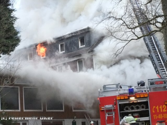 Kurz nach Ankunft der Einsatzkräfte aus Oker kam es zu einer Rauchgasdurchzündung. Zu der starken Rauchentwicklung, die bis in den Oberharz zu sehen war, gab es jetzt eine offene Flammenbildung. Mehrere Trupps mit schwerem Atemschutz ausgerüstet, 4 B-Rohre, mehrere C-Rohre und zwei Wenderohre waren im Einsatz, um die Flammen zu bekämpfen. Ein Trupp öffnete das Garagentor und fand einen PKW vor, fast zeitgleich kam die Meldung über den Fund eines verstorbenen Hundes. So wurden weitere Trupps in das Gebäude geschickt, um nach eventuell im Gebäude befindlichen Personen zu suchen. Doch nach kurzer Zeit musste der Innenangriff abgebrochen werden, da das Gebäude Einsturzgefährdet und die Hitzeentwicklung zu groß war. Gegen sieben Uhr waren auch die Ortsfeuerwehren aus Hahndorf, Jerstedt und Langelsheim am Einsatzort eingetroffen. Die Feuerwehr Hahndorf übernahm die Zentrale Atemschutzüberwachung. Von dort aus wurde der gesamte Atemschutzeinsatz mit den Trupps aus den sechs Feuerwehren koordiniert. Der Atemschutzcontainer der FTZ, sowie das DRK sorgten für Nachschub bzw. für Verpflegung. Eine enorme Hitze und Wind sorgten immer wieder für eine entfachung der Flammen an verschiedenen Stellen. Die Wasserversorgung wurde aus der nahe fließenden Gose, sowie einem Fischteich mit 3 PFPN und zwei Löschfahrzeugen sichergestellt.