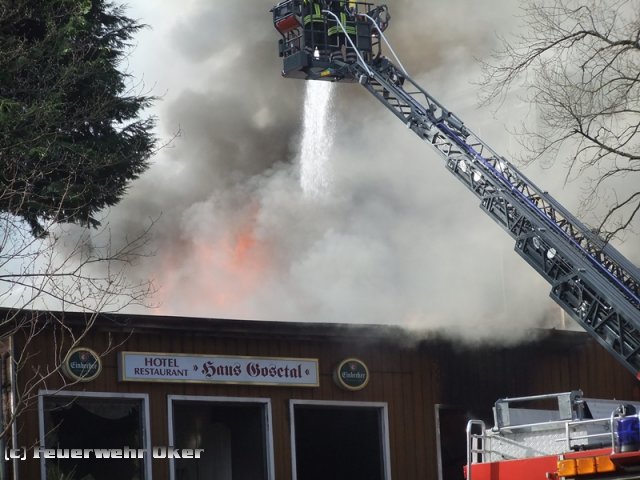 Um 06.08 Uhr wurde ein Rettungswagen, der gerade auf dem Weg von Clausthal-Zellerfeld nach Goslar war, von einem Autofahrer angehalten und auf eine starke Rauchentwicklung an der B241 aufmerksam gemacht und informierten die Feuerwehreinsatz- und Rettungsleitstelle. Die Kameraden aus Goslar waren gerade noch auf dem Rückweg einer ausgelösten Brandmeldeanlage in der Baßgeige, dadurch konnte innerhalb kurzer Zeit eine Lage- erkundung vorgenommen werden. Zu diesem Zeitpunkt drang dichter Qualm aus fast dem gesamten Gebäude des Restaurants und Hotels Haus Gosetal. Daraufhin wurden auch die Ortsfeuerwehren Oker und Hahnenklee-Bockswiese mit einer zweiten Drehleiter alarmiert.
