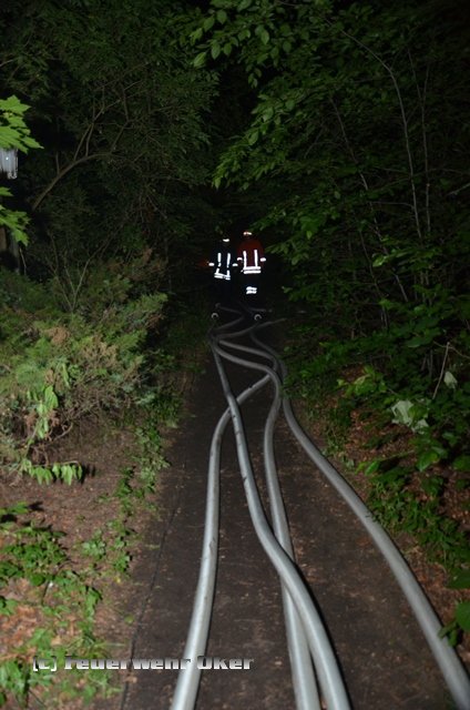 Um 20.53 Uhr wurde auch die Feuerwehr Oker zur Einsatzstelle alarmiert. Am Teich im Kurpark Bad Harzburg wurde mit der tragbaren Pumpe (PFPN) eine Wasserentnahmstelle eingerichtet. Die Radau musste für die Löschwasserentnahme angestaut werden. Über 800m B-Druckschläuche verlegten die Einsatzkräfte der Feuerwehr Oker aufgeteilt auf zwei parallele Wasserförderleitungen zur Gebäuderückseite und speisten dort zwei Wasserwerfer ein. Das Tanklöschfahrzeug wurde aus dem Einsatz heraus gehalten und stand als Bereitschaft für Einsätze in der Stadt Bad Harzburg bis 7 Uhr am Folgetag bereit. Ein Einsatz war zum Glück aber nicht erforderlich.
