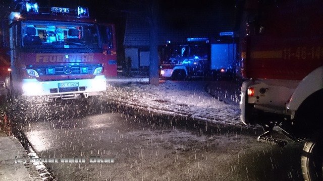 Um 18:19 Uhr lösten die digitalen Meldeempfänger der okeraner Feuerwehr mit dem Einsatzstichwort "Zimmerbrand" aus. Sofort machten sich die Kameraden im Schneegestöber auf den Weg zur Feuerwache. Von dort aus ging es zuerst in die Sankt-Konrad-Straße, dies war allerdings ein Versehen der ortsfremden Anrufer. Die Einsatzstelle lag auf der Straße Am Stadtpark, konnte allerdings trotzdem schnell gefunden werden.