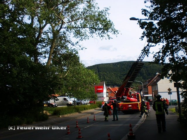 Die Polizei meldete am 28. Juli um 17.35 Uhr einen großen Ast in der Bahnhofstraße, der auf die Fahrbahn zu fallen drohte. Da der Bauhof mit anderen Aufgaben beschäftigt war alarmierte die Leitstelle die Feuerwehren Goslar mit der Drehleiter, sowie die zuständige Ortsfeuerwehr Oker.