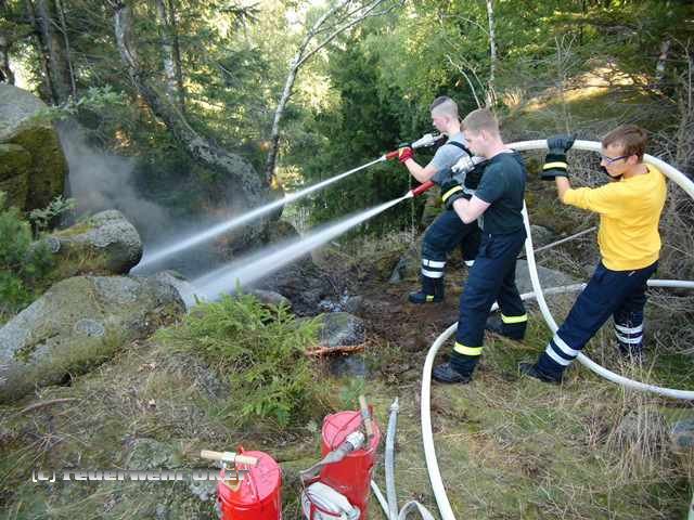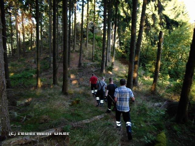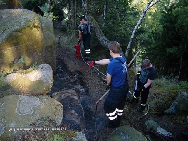 Der Mannschaftstransportwagen fuhr als erstes Fahrzeug in Richtung Einsatzstelle. Die Löschfahrzeuge gingen am Waldhaus in Bereitschaft. Nach mehreren Kilometern Waldweg konnte der Anrufer gesichtet werden. Vom befahrbaren Weg waren es dann noch 400m Fußmarsch über Trampelpfade und Klippen bis stellvertretender Ortsbrandmeister Florian Rowold die Einsatzstelle erreichte. Dort brannte das Unterholz auf einer Fläche von knapp zwei Quadratmetern.