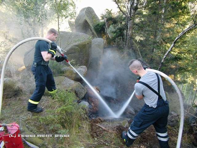 Ein Kletterer stellte am frühen Sonntagmorgen gegen 07:50 Uhr einen Schwelbrand an der Felswand "Ziegenrücken" im Okertal fest. Daraufhin wurde die Ortsfeuerwehr Oker in das Okertal alarmiert.