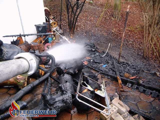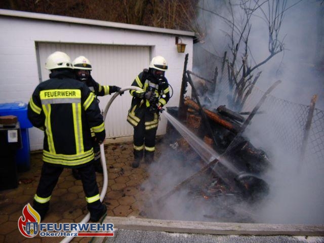 Im Okeraner Sonnenbrink brach aus noch ungeklärter Ursache am Samstagmittag ein Feuer in einem Holzunterstand aus. Nachdem die Anwohner das Feuer bemerkten alarmierten sie sofort die Feuerwehr.