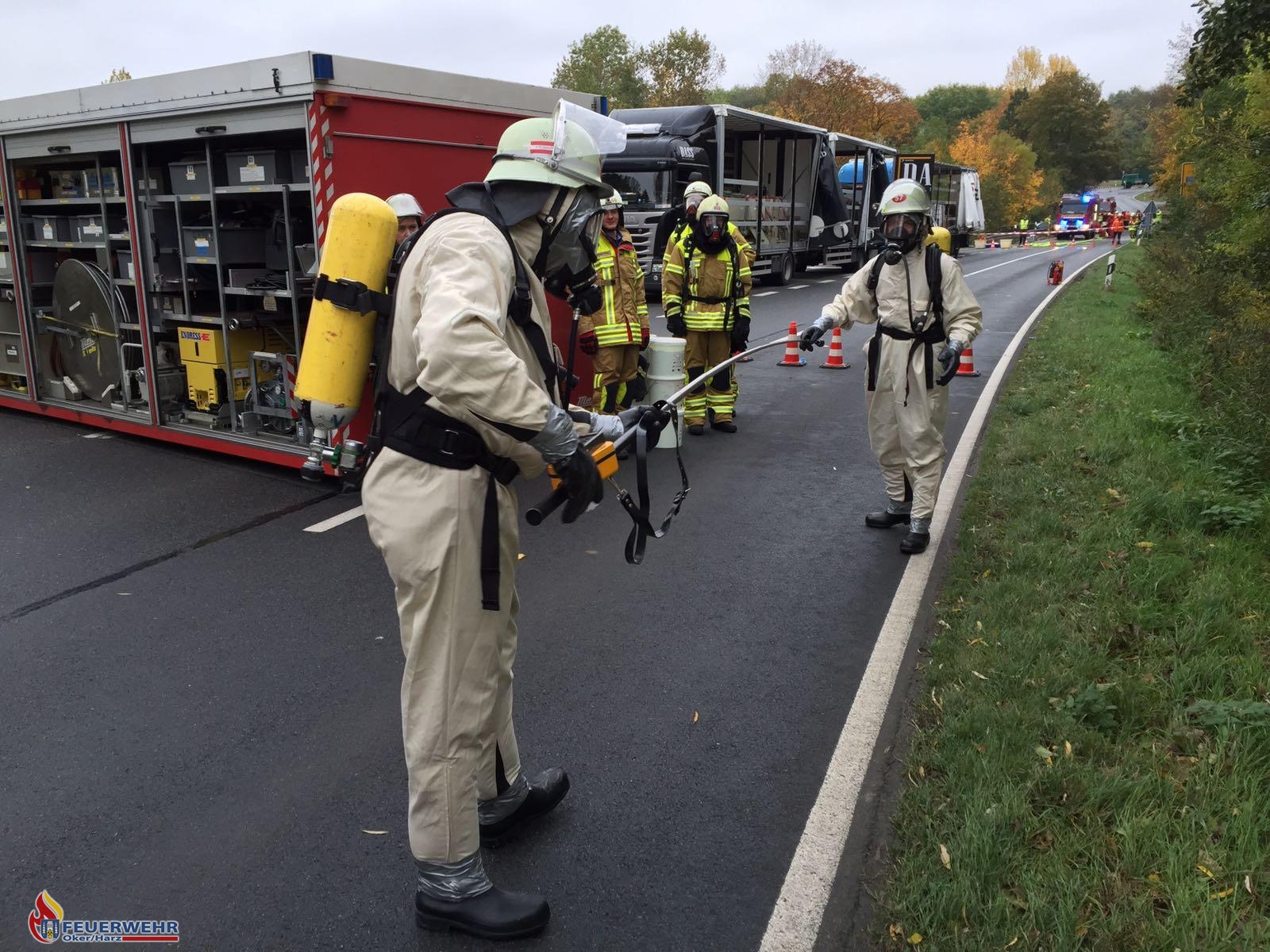 Am Freitagmittag trat aus einem LKW eine unbekannte Flüssigkeit aus. Da auch der Fahrer der Polizei nicht mitteilen konnte was für eine Flüssigkeit aus seinem LKW austrat wurde zunächst "Gefahrgut Klein" ausgelöst. Die Feuerwehr Bad Harzburg machte sich auf den Weg zur Einsatzstelle. Nachdem sich Einsatzleiter Markus Hirsch einen Überblick über die Lage verschafft hatte ließ er "Gefahrgut Groß" auslösen. So wurden auch der Einsatzleitwagen und die Pressegruppe der Kreisfeuerwehr alarmiert. Dieser gehört auch ein Kamerad der Ortsfeuerwehr Oker an. Er machte sich mit seinem Privatwagen auf den Weg zur Einsatzstelle.
