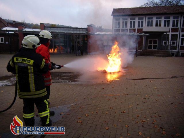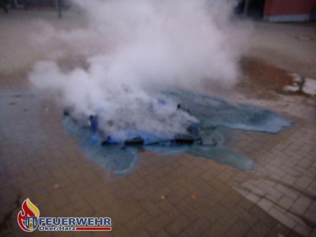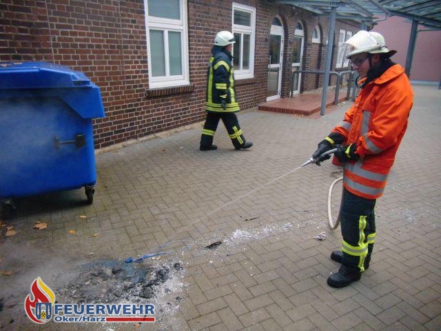 Auf dem Schulhof der Grundschule in Unteroker stand am Freitagnachmittag eine große Altpapiertonne in Brand. Das beherzte Eingreifen zweier Passanten verhinderte dabei schlimmeres. Als die Flammen bereits aus der Tonne empor schlugen zogen die Passanten die Tonne vom Gebäude weg in die Mitte des Schulhofes. Die alarmierte Feuerwehr Oker rückte mit dem Tanklöschfahrzeug an und löschte das Feuer mit etwa 800 Litern Wasser. Auch an dem ursprünglichen Standort der Tonne mussten Glutnester mit einem Kleinlöschgerät abgelöscht werden. Von der Altpapiertonne blieb schließlich nur ein Haufen geschmolzenes Plastik über.