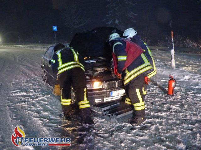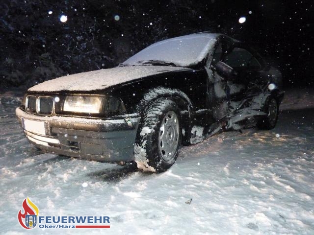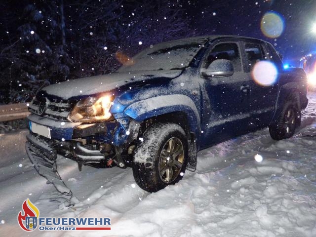 Bereits die Anfahrt von Zuhause zur Feuerwache konnten die alarmierten Kräfte nur unter erhöhter Vorsicht vornehmen, da der am Tag angetaute Schnee eine Eisfläche auf den Fahrbahnen bildete. Mit dem Wetter angepasster Geschwindigkeit machten sich der Mannschaftswagen und zwei Löschfahrzeuge aus Oker auf den Weg ins Okertal. Einsatzleiter Florian Rowold erreichte zuerst die Einsatzstelle und verschaffte sich einen Überblick über die Unfallstelle. Sogleich konnte er Entwarnung geben, die beim Notruf noch eingeklemmte Person konnte von Ersthelfern aus ihrem Fahrzeug befreit werden und befand sich bereits in einem anderen Fahrzeug. Die Feuerwehr Goslar konnte daraufhin die Einsatzfahrt abbrechen und wieder einrücken. Das okeraner Löschfahrzeug 8/6 sperrte die B498 in Richtung Okertal in Höhe der ehemaligen Gaststätte Waldhaus. Das Löschfahrzeug 10/6 fuhr zur Einsatzstelle durch und übernahm Aufgaben vor Ort. Die verletzten Personen wurden bis zum Eintreffen des Rettungsdienstes betreut, die Einsatzstelle mit dem Lichtmast des Fahrzeuges ausgeleuchtet und das stark beschädigte Fahrzeug gesichert. Eine Person konnte durch den Rettungsdienst am Unfallort versorgt werden. Der junge Mann, der zu Beginn noch eingeklemmt war, hatte die Nacht einen Schutzengel an seiner Seite. Er kam mit leichten Verletzungen in das Goslarer Krankenhaus. Nach gut einer halben Stunde war der Einsatz im Schneetreiben für das Löschfahrzeug 10/6 und den Mannschaftswagen am Unfallort abgeschlossen und die Einsatzstelle an die Polizei übergeben. Das Löschfahrzeug 8/6 erhielt auf bitten der Polizei die Straßensperrung im Bereich Waldhaus noch bis zirka 1.30 Uhr, zur Bergung der Unfallfahrzeuge, aufrecht.