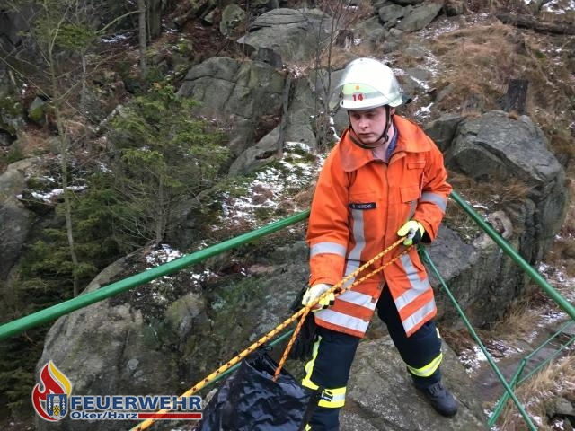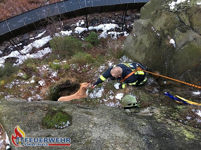 Im Okertal geriet ein Hund auf Abwege. Vermutlich aus Neugier kletterte der Hund durch ein Geländer an einem Felsvorsprung und rutschte dort einige Meter in die Tiefe. Da dieser Felsen ohne geeignete Ausrüstung nicht zu erreichen war alarmierte der Besitzer die Feuerwehr.