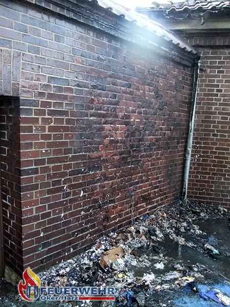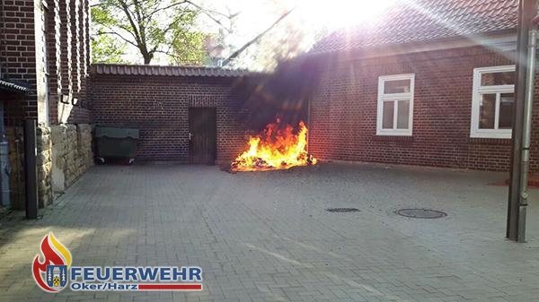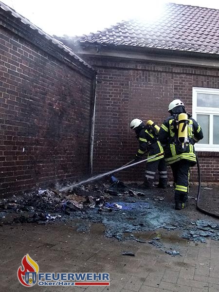 Erneut stand auf dem Schulhof der Grundschule Unter-Oker eine große Altpapiertonne in Brand. Bei der letzten brennenden Altpapiertonne auf dem Schulhof war diese von Passanten bereits auf die Mitte des Schulhofes gerollt worden. Dieses Mal war die brennende Tonne direkt neben einem Gebäudeteil der Grundschule zu finden. Durch die rasche Vornahme des Schnellangriffsschlauches konnte eine Ausbreitung des Feuers auf das Gebäude verhindert werden.