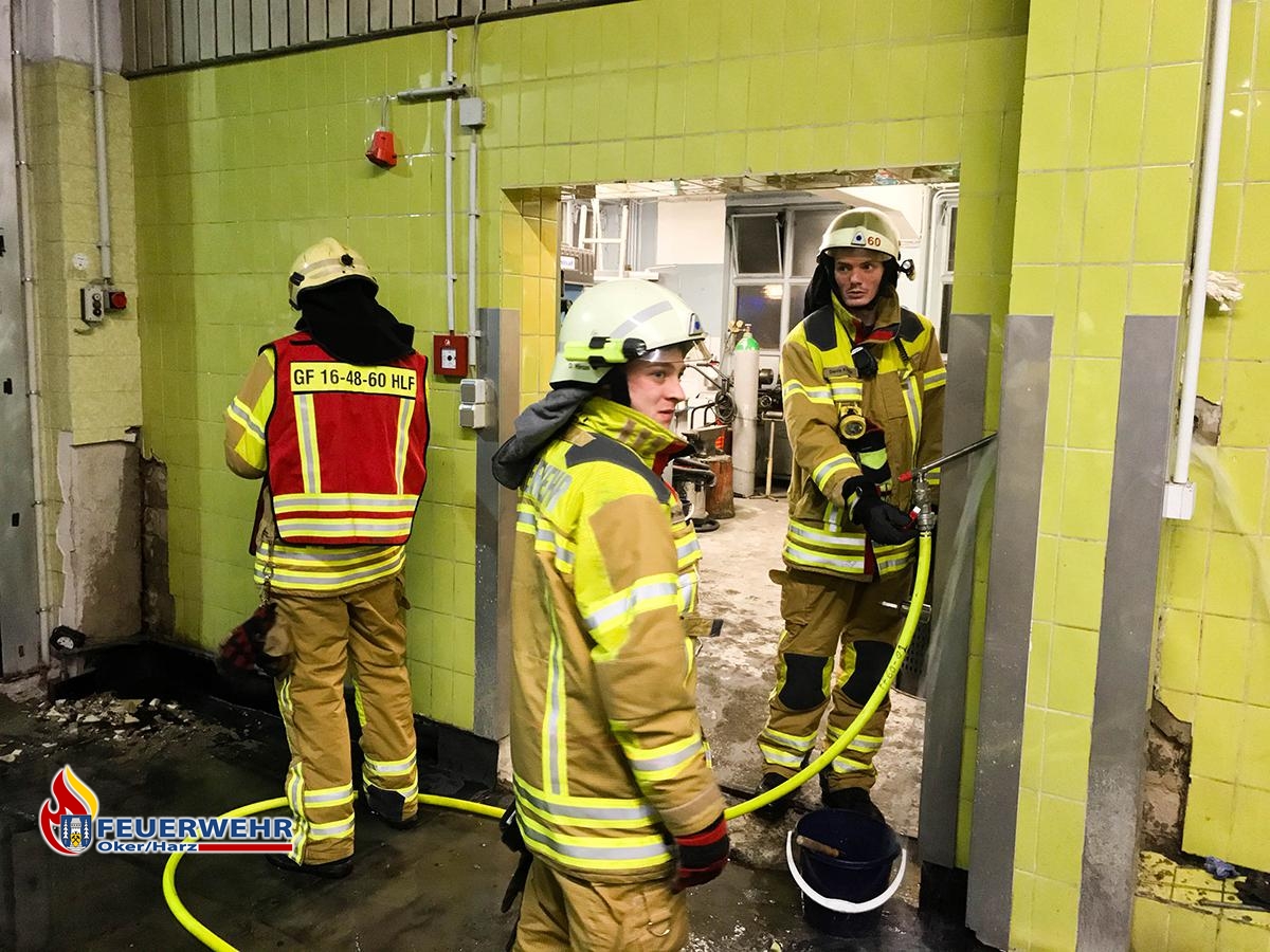 Um eine weitere Ausbreitung zu verhindern wurde mit einem Kleinlöschgerät der betroffene Bereich gewässert. Da aber nur ein Spalt von 4-5 cm zwischen dem Betonpfosten und der Außenwand zur Verfügung stand, konnten eventuelle Glutnester im hinter Bereich nicht erreicht werden. Daraufhin entschied die Einsatzleitung, die Feuerwehr Bad Harzburg mit sogenannten FogNails nachalarmieren zu lassen. Mit Hilfe von FogNails lassen sich auch eventuelle Glutnester im hinteren Bereich ablöschen. Nach einem kurzem Einsatz der FogNails konnte schnell ein Erfolg verzeichnet werden.