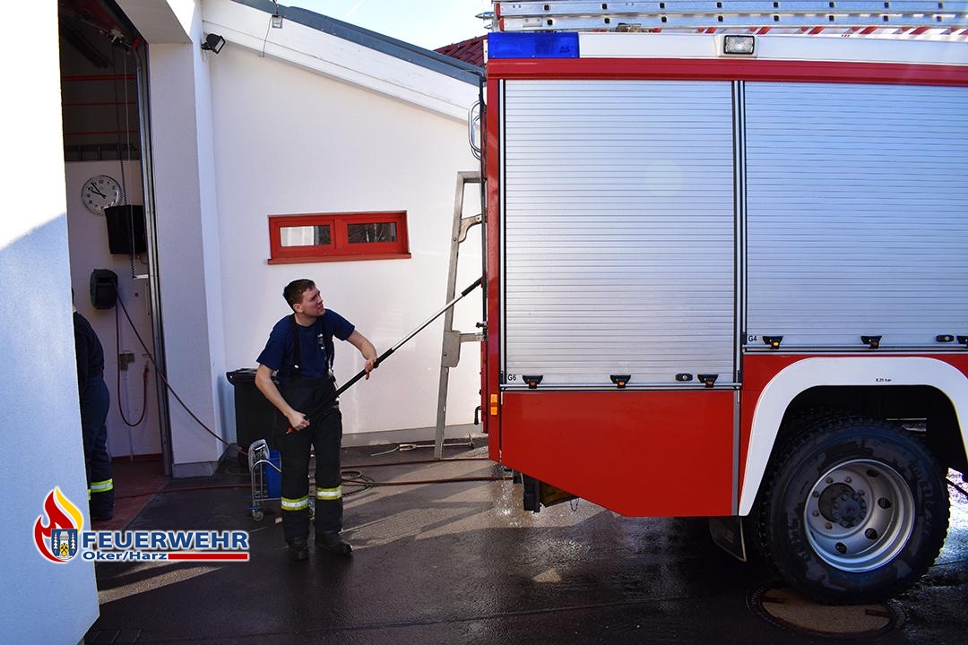 Zusammen mit der mittlerweile eingetroffenen Goslarer Feuerwehr musste nun noch die Brandbekämpfung zu Ende geführt werden. Da die Sichtweite immer noch sehr eingeschränkt war blieben auch Belüftungsarbeiten nicht aus. Bis alle Brandnester gefunden waren und das Obergeschoss ohne Atemschutz wieder betreten werden konnte dauerte es bis circa 8:30 Uhr. Nach insgesamt dreieinhalb Stunden machten sich die letzten Einsatzkräfte gegen 9:00 Uhr auf den Weg in die Feuerwache. Dort blieb das Reinigen der dreckigen Fahrzeuge und Gerätschaften nicht aus.