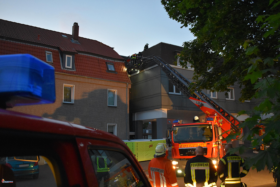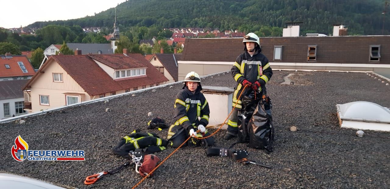 Bis diese vor Ort war machten sich zunächst jedoch mehrere Kameraden auf den Weg auf das Dach. Ziel war es die Person zunächst mit Seilen von oben zu sichern. Nach ihrem Eintreffen an der Einsatzstelle brachten die Goslarer Kameraden die Drehleiter in Position und bauten als zusätzliche Sicherung einen Sprungretter am Boden auf. Währenddessen machte sich ein mit Leinen gesicherter Kamerad an den Abstieg vom Dach auf den Vorsprung hinab. Dort sicherte er die Person mit weiteren Leinen, sodass ein sicherer Übergang von der Kante in den Drehleiterkorb möglich war. Ein paar Augenblicke später hatten alle wieder sicheren Boden unter den Füßen.