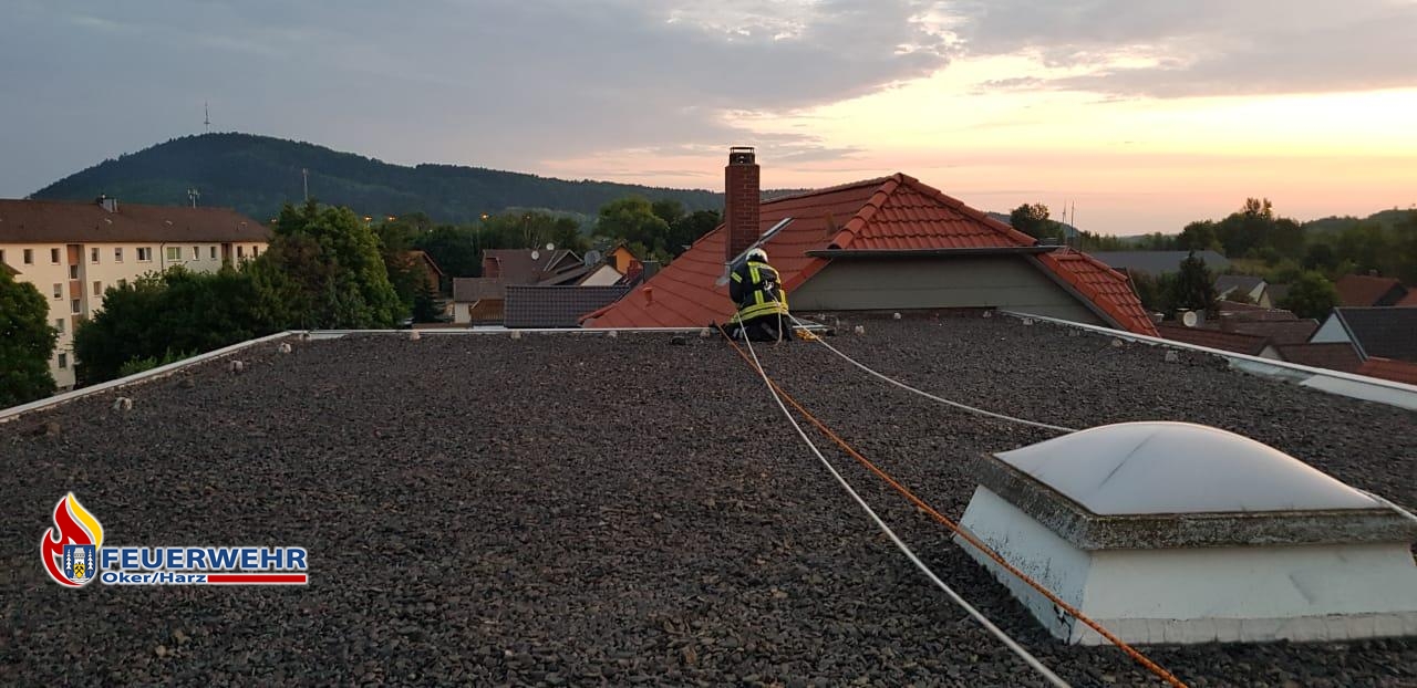 Viertel nach vier Uhr morgens wurde unsere Hilfe auf einem Dach in der Bahnhofstraße benötigt. Nach der Ankunft an dem Gebäude konnte die Person auf einem schmalen Vorsprung ein Stück unterhalb der Dachkante ausfindig gemacht werden. Da es in dieser Position nur unter sehr großem Risiko möglich gewesen wäre sich zu bewegen, kamen wir zur Hilfe. Erschwerend kam hinzu, dass der Vorsprung vom Boden mit den herkömmlichen Leitern nur sehr schwer erreichbar war. Hier sollte die nun ebenfalls alarmierte Drehleiter der Feuerwehr Goslar Abhilfe schaffen.