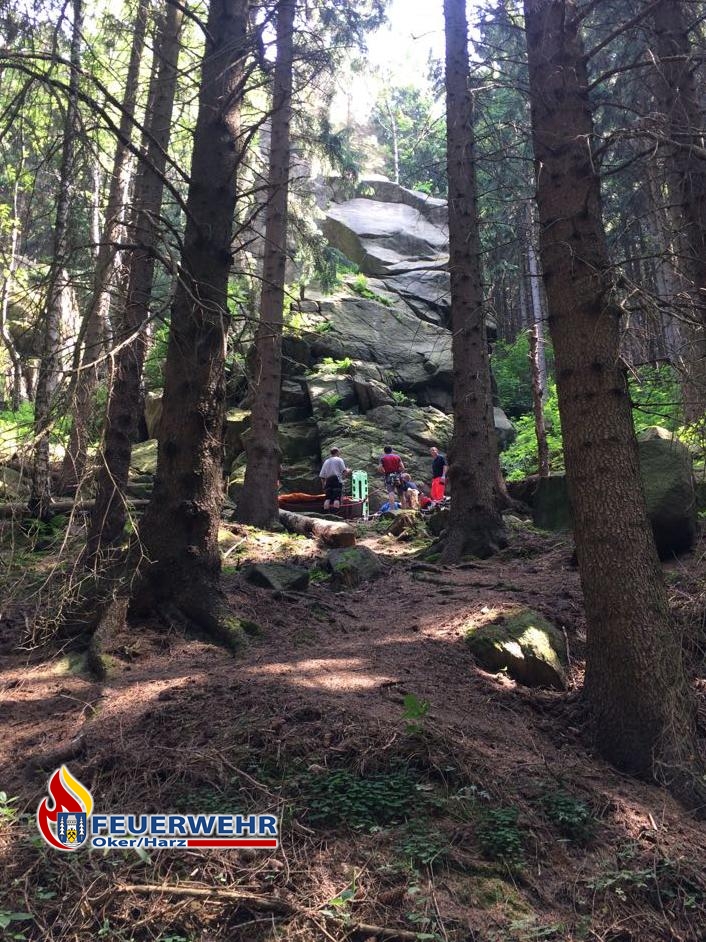 Die Alte Harzstraße ermöglichte es den kleineren Einsatzfahrzeugen bis auf 150 Meter an den Felsen heranzufahren. Der restliche Weg musste jedoch durch unwegsames Gelände entgegen der Steigung des Berges zu Fuß bewältigt werden. Als die vorgehenden Kräfte auch diesen Teil des Weges hinter sich gelassen hatten, startete der Rettungsdienst mit der Versorgung des Patienten. Mit Hilfe einer Gebirgstrage der Bergwacht und vereinten Kräften konnte der verunfallte Kletterer hinunter auf die Alte Harzstraße gebracht werden. Dort war in der Zwischenzeit ein Rettungswagen zur weiteren Versorgung vorbereitet worden.