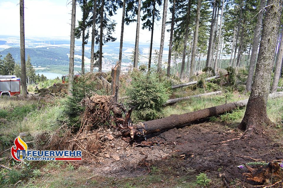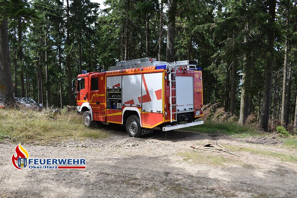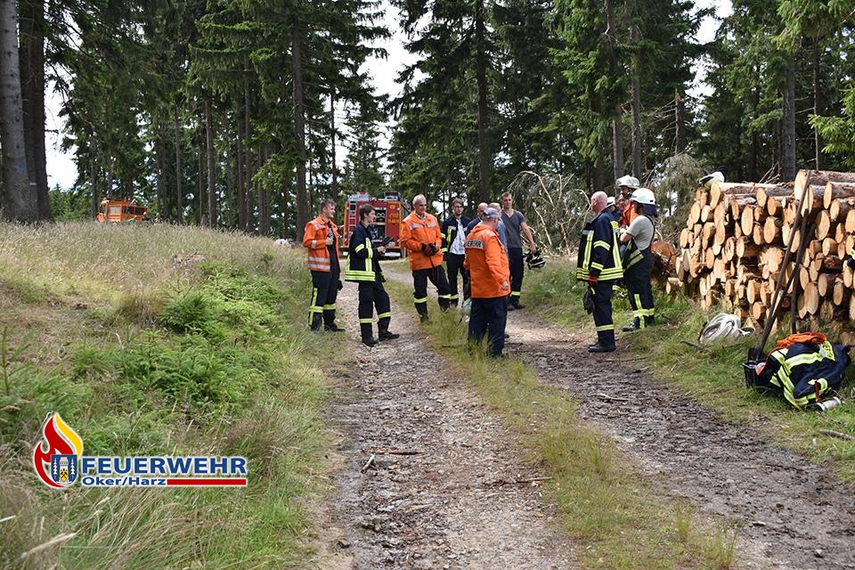 Da nicht genau klar war über welche Wege eine Anfahrt zur Einsatzstelle mit den Großfahrzeugen möglich war, wurde telefonisch Kontakt mit dem zuständigen Revierförster Martin Paucke aufgenommen und ein Treffpunkt ausgemacht um dort das weitere Vorgehen zu besprechen und die Anfahrtswege festzulegen. In Folge dessen fuhren der Stadtbrandmeister und Okers stellv. Ortsbrandmeister zusammen mit dem Revierförster schnellstmöglich die Brandstelle an um zunächst einen Überblick über das Ausmaß des Brandes zu bekommen. Vor Ort stellten sie fest, dass ca 30 qm Waldboden brannten. Dabei hatte sich das Feuer schon tief in den trockenen Boden gefressen.