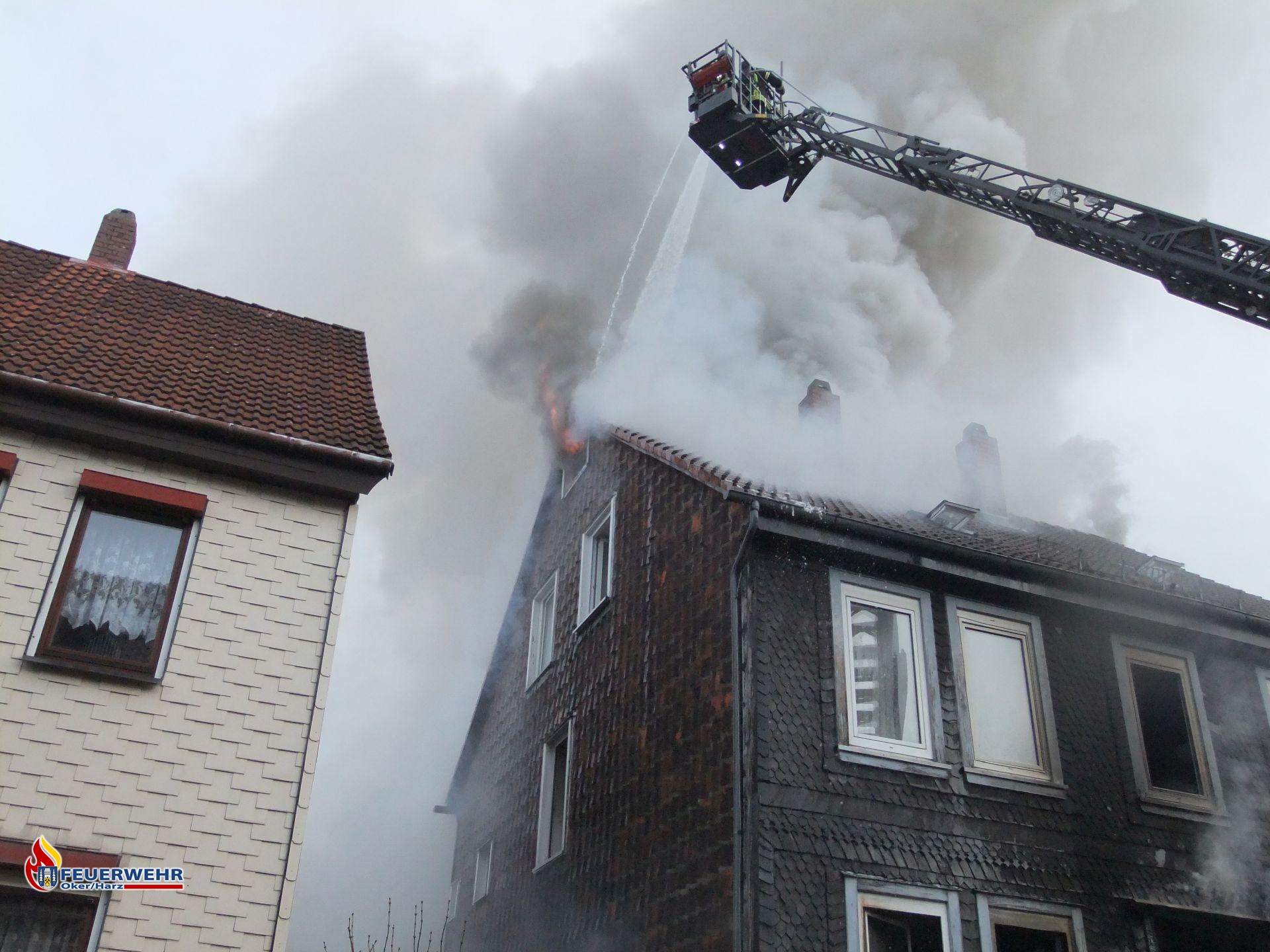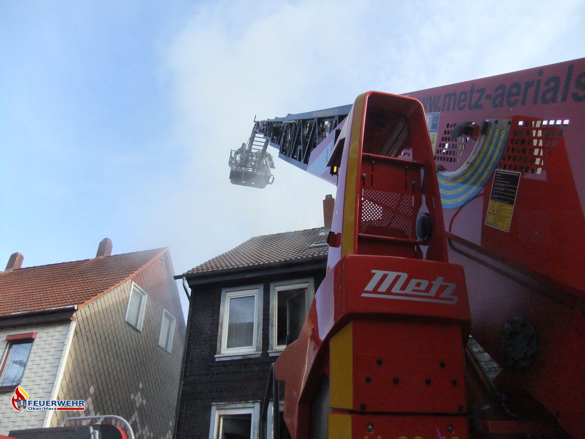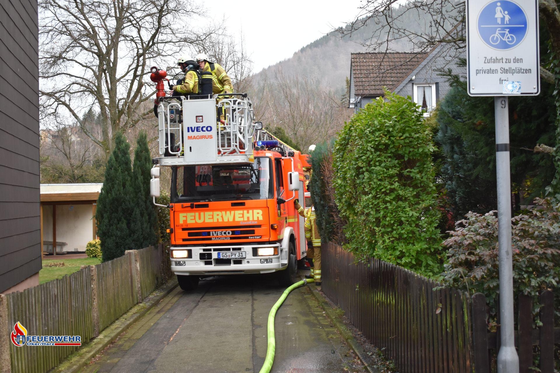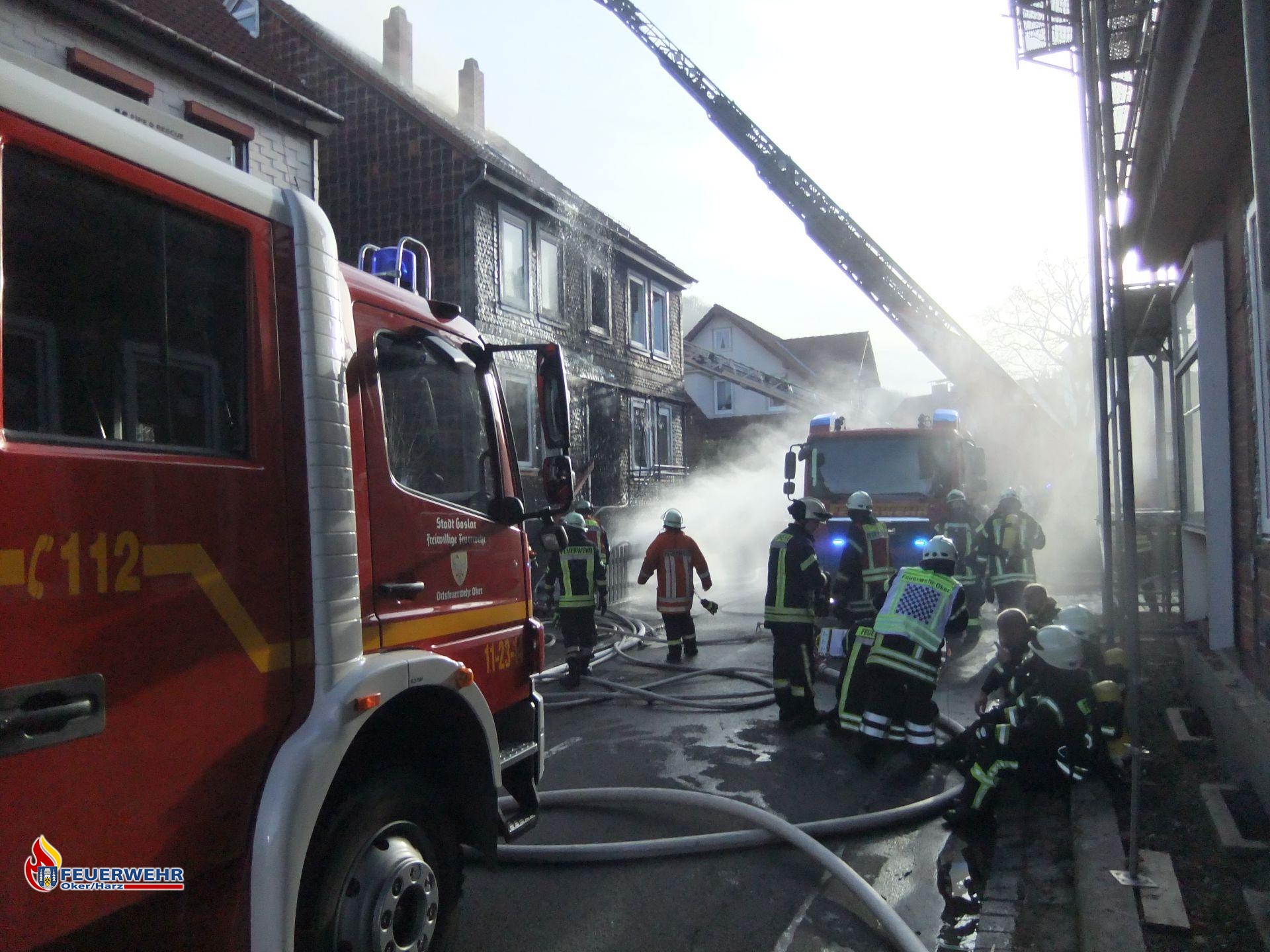 Der erste Angriffstrupp des Okeraner Tanklöschfahrzeuges begann unmittelbar mit der Brandbekämpfung von außen. Zu diesem Zeitpunkt schlugen die Flammen bereits meterhoch aus der Haustür. Ein Vorankommen war aufgrund der starken Brandausbreitung und Hitzeentwicklung nur schwer möglich. Um die oberen Geschosse zu erreichen und die vermissten Personen suchen zu können musste zuvor erst das Feuer im Erdgeschoss abgelöscht werden, um die Treppe dorthin zu sichern. Zeitgleich begann die Ortsfeuerwehr Goslar auf der Gebäuderückseite, am Anbau des Wohnhauses, mit der Menschenrettung im Obergeschoss. Hierbei kamen mehrere Steckleitern zum Einsatz. Allerdings war die Brandintensität auch dort bereits soweit vorangeschritten, dass das Gebäudeinnere nur schwer erreicht werden konnte. Nachdem die Flammen gebändigt werden konnten begann unverzüglich das Absuchen der Obergeschosse nach Personen. Nachdem alle Räume mehrfach erfolglos abgesucht wurden kam zum Glück die Entwarnung, dass alle Anwohner durch die Polizei kontaktiert werden konnten und sich niemand mehr im Gebäude aufhielt.