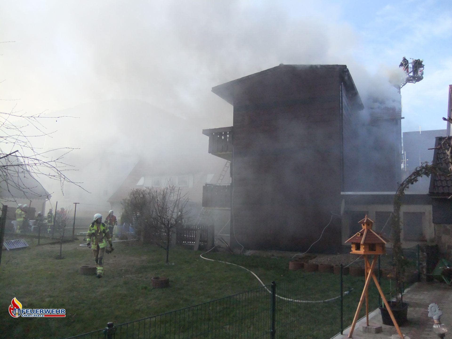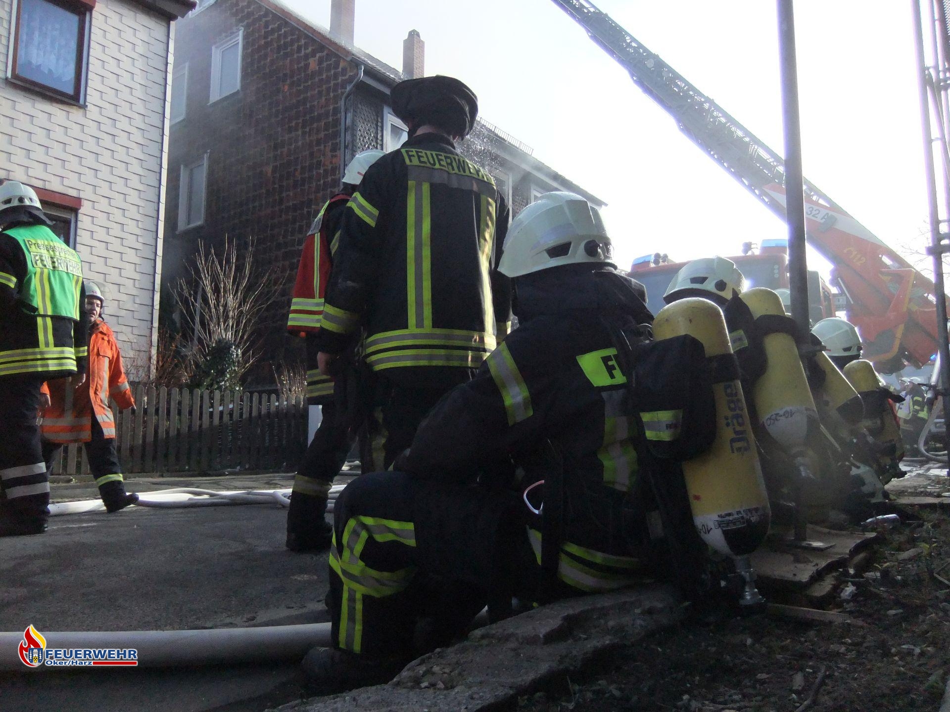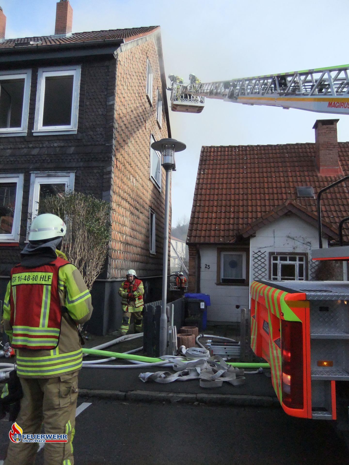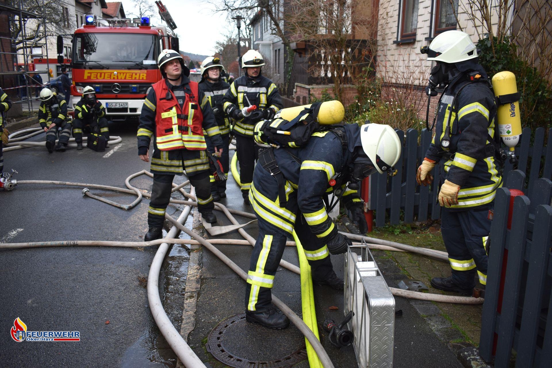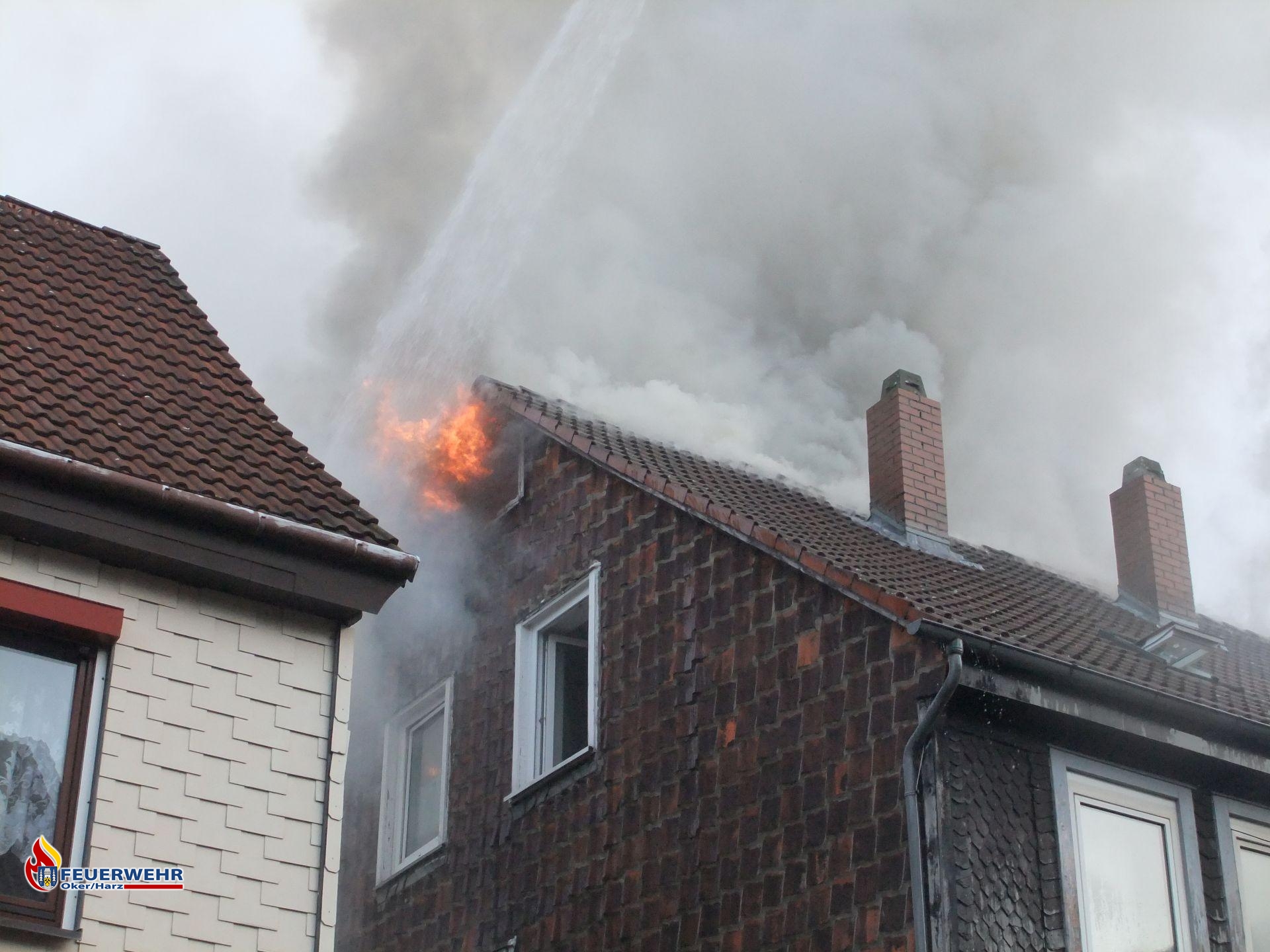 Der erste Angriffstrupp des Okeraner Tanklöschfahrzeuges begann unmittelbar mit der Brandbekämpfung von außen. Zu diesem Zeitpunkt schlugen die Flammen bereits meterhoch aus der Haustür. Ein Vorankommen war aufgrund der starken Brandausbreitung und Hitzeentwicklung nur schwer möglich. Um die oberen Geschosse zu erreichen und die vermissten Personen suchen zu können musste zuvor erst das Feuer im Erdgeschoss abgelöscht werden, um die Treppe dorthin zu sichern. Zeitgleich begann die Ortsfeuerwehr Goslar auf der Gebäuderückseite, am Anbau des Wohnhauses, mit der Menschenrettung im Obergeschoss. Hierbei kamen mehrere Steckleitern zum Einsatz. Allerdings war die Brandintensität auch dort bereits soweit vorangeschritten, dass das Gebäudeinnere nur schwer erreicht werden konnte. Nachdem die Flammen gebändigt werden konnten begann unverzüglich das Absuchen der Obergeschosse nach Personen. Nachdem alle Räume mehrfach erfolglos abgesucht wurden kam zum Glück die Entwarnung, dass alle Anwohner durch die Polizei kontaktiert werden konnten und sich niemand mehr im Gebäude aufhielt.
