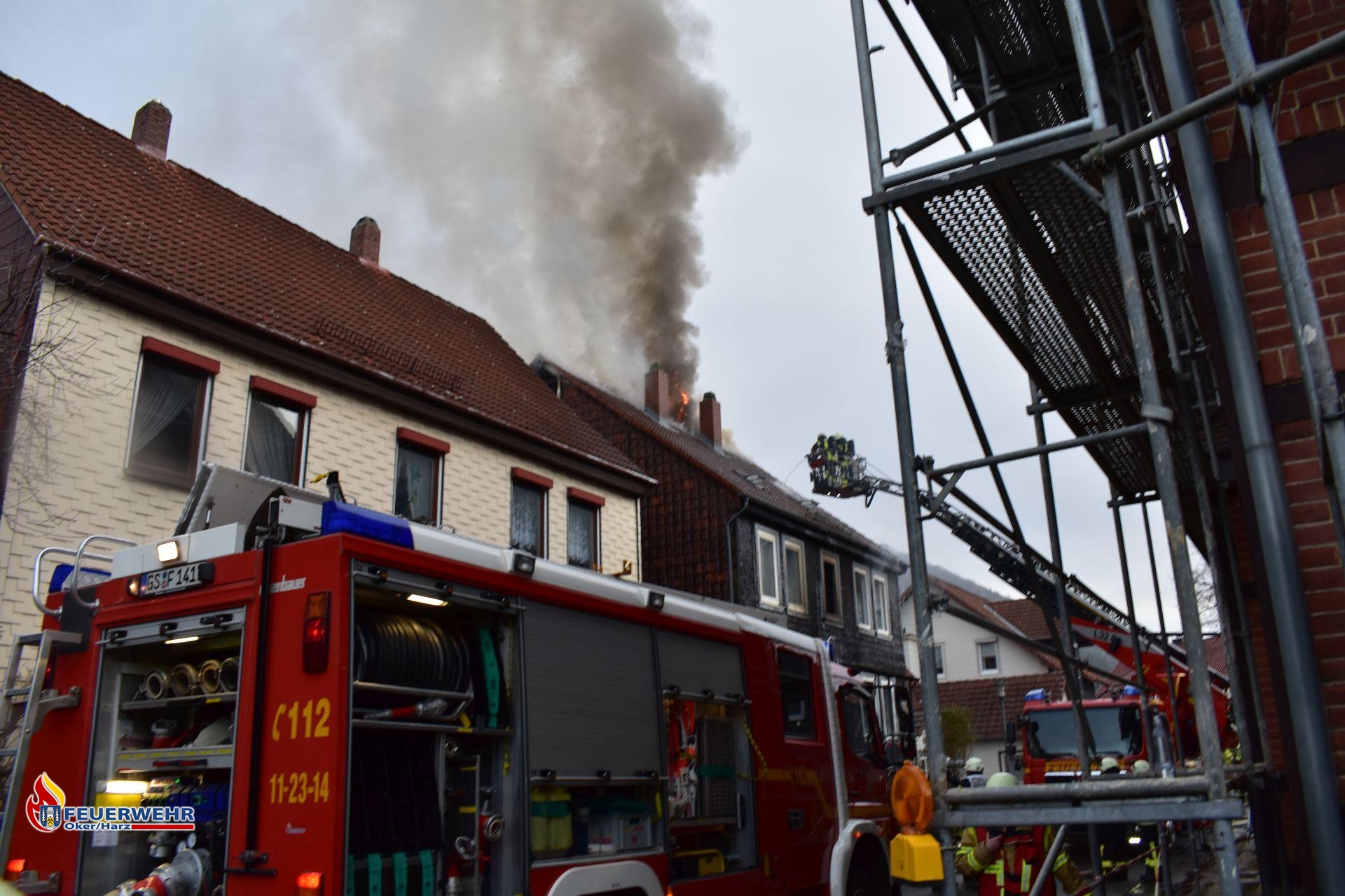 Der stellvertretende Ortsbrandmeister aus Oker Florian Rowold traf zuerst an der Einsatzstelle ein und konnte die Lage des Gebäudebrandes bestätigen. Gerade bei seinem Eintreffen gab es eine Rauchgasdurchzündung, die dafür sorgte, dass die linke Seite des Erdgeschosses in Vollbrand stand und die Flammen bis auf den Gehweg schlugen. Sofort wurde in Oker die Sirene ausgelöst, um alle Einsatzkräfte zu erreichen und die Bevölkerung zu warnen. Zeitgleich erfolgte in Absprache mit Stadtbrandmeister Christian Hellmeier die Nachalarmierung der Gesamtwehr aus Goslar, sowie der Bad Harzburger Feuerwehr mit einer zweiten Drehleiter. Benachbarte Anwohner vermuteten noch bis zu vier Personen in den oberen Geschossen des Gebäudes.