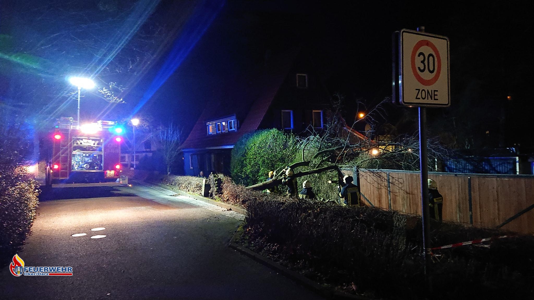 Die zunächst gerufene Polizei sperrte den Bereich um den Baum ab und verständigte die Einsatzleitstelle der Feuerwehr. Der Baum wurde von den Einsatzkräften zersägt und für den späteren Abtransport an einer Stelle gesammelt. Während der Sägearbeiten war die Messingstraße gesperrt.