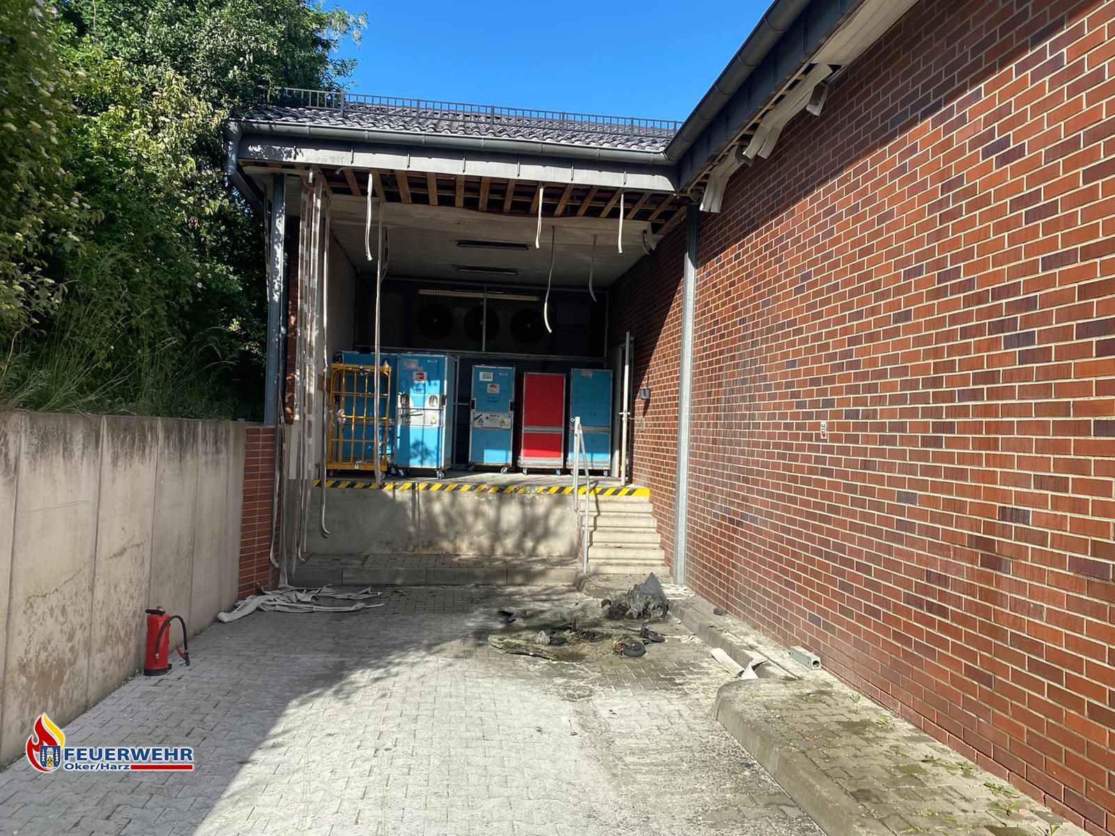 Zwei Löschfahrzeuge machten sich unmittelbar auf den Weg. Beim Eintreffen des ersten Löschfahrzeuges, waren keine Flammen mehr zu sehen. Ein zufällig anwesender Feuerwehrmann aus Altenau hatte bereits erfolgreich erste Löschversuche mit Feuerlöschern unternommen. Der Angriffstrupp nahm einen Schnellangriffsschlauch vor und löschte die Überreste ab. Bei Begutachtung der Umgebung stellten die Einsatzkräfte fest, dass bereits große Teile der Dachkastenverkleidung geschmolzen waren. Vorsorglich wurden die Stellen des Daches geöffnet und kontrolliert. Hierbei wurden einzelne Glutnester gefunden und abgelöscht. Zeitgleich drangen weitere Kameraden von innen auf den Dachboden des Marktes vor und kontrollierten dort die betroffenen Bereiche ebenfalls. Nach rund 30 Minuten konnten keine weiteren Glutnester gefunden werden.