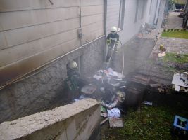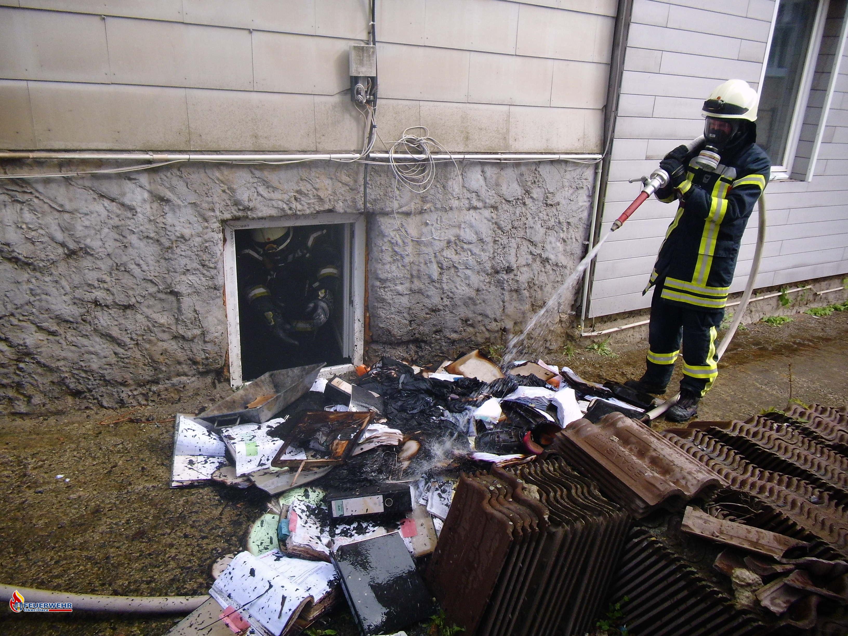 Um die brennenden Materialen, die überwiegend aus Papier und Pappe bestanden, vollständig ablöschen zu können, wurden diese durch zwei Atemschutztrupps ins Freie verbracht und dort ausgiebig gewässert. Im Anschluss wurden die Kellerräume nochmals auf letzte Glutnester kontrolliert und alle Räume und Treppenhäuser mit insgesamt drei Hochdrucklüftern vom Brandrauch befreit. Nach knapp 1 1/2 Stunden war der Einsatz beendet. Es folgte die übliche, lange Nachbereitung mit Tausch der Einsatzkleidung, von Schläuchen und Atemschutzutensilien. Nach drei Stunden konnten auch die letzten Einsatzkräfte wieder nach Hause beziehungsweise zu ihrer Arbeitsstelle.