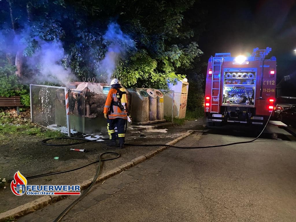 Der neue Tag startete für die Okeraner Einsatzkräfte kurz nach Mitternacht mit einem Containerbrand an der Harzburger Straße. Zunächst wurde der Papiercontainer und die nahestehenden Bäume mit Wasser gekühlt. Der anschließende Versuch das Feuer im Inneren des Containers zunächst mit Wasser und anschließend mit Schaum zu löschen, zeigte jedoch nicht den gewünschten Erfolg.