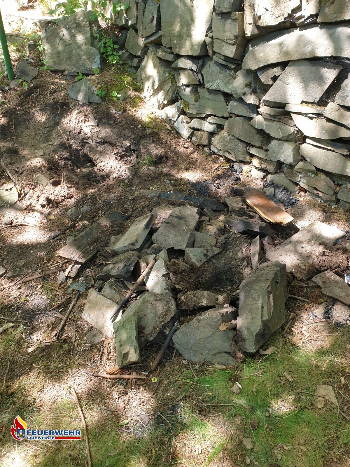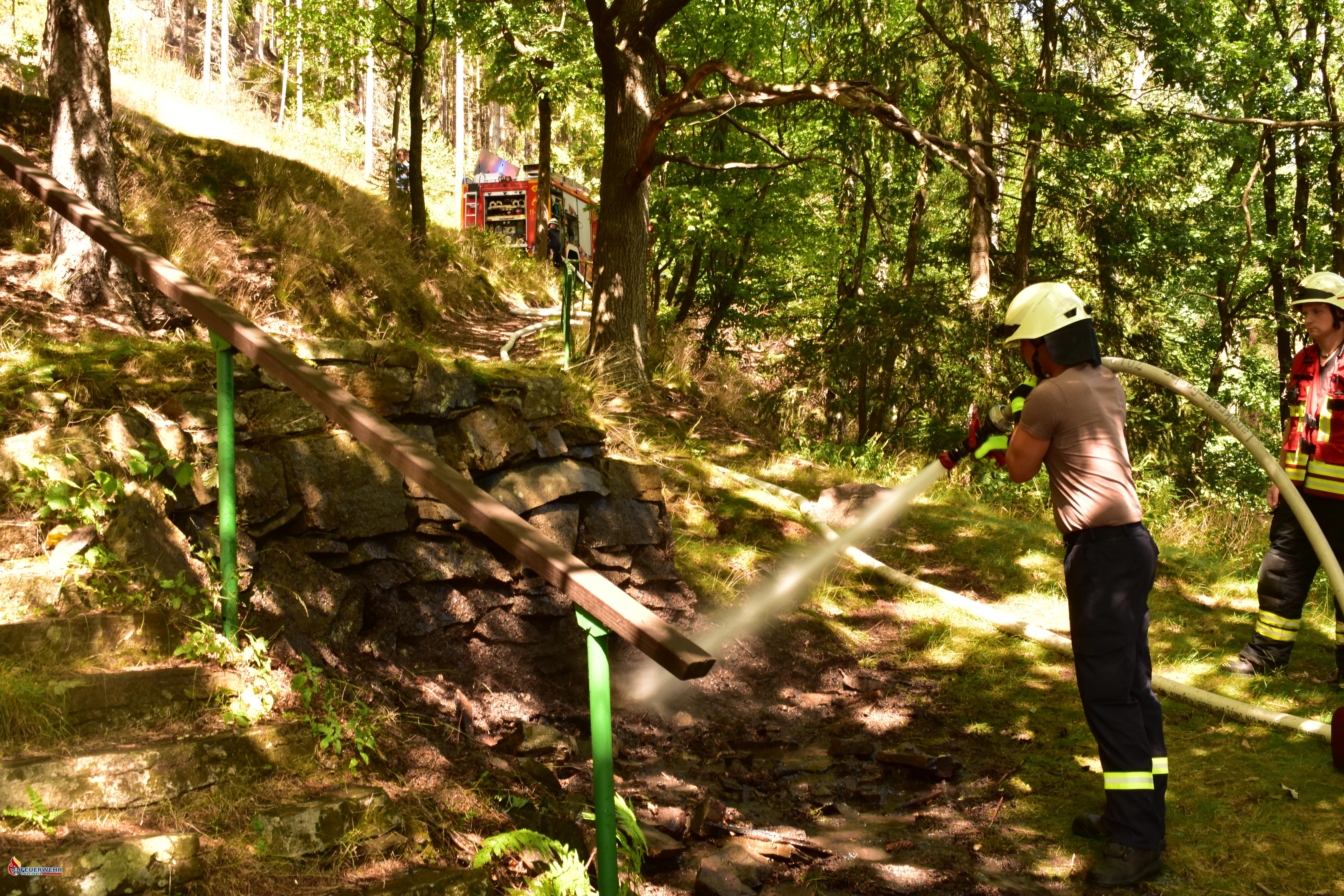 Wanderer entdeckten bei einem Abstecher zu den Halleschen Höhen ein noch brennendes Lagerfeuer. Mit ihren ersten Löschversuchen konnten sie bereits die meisten Flammen niederschlagen. Jedoch stieg weiterhin noch Rauch aus dem Boden auf und ein Blick mit der Wärmebildkamera zeigte, dass die Brandstelle noch sehr heiß war.