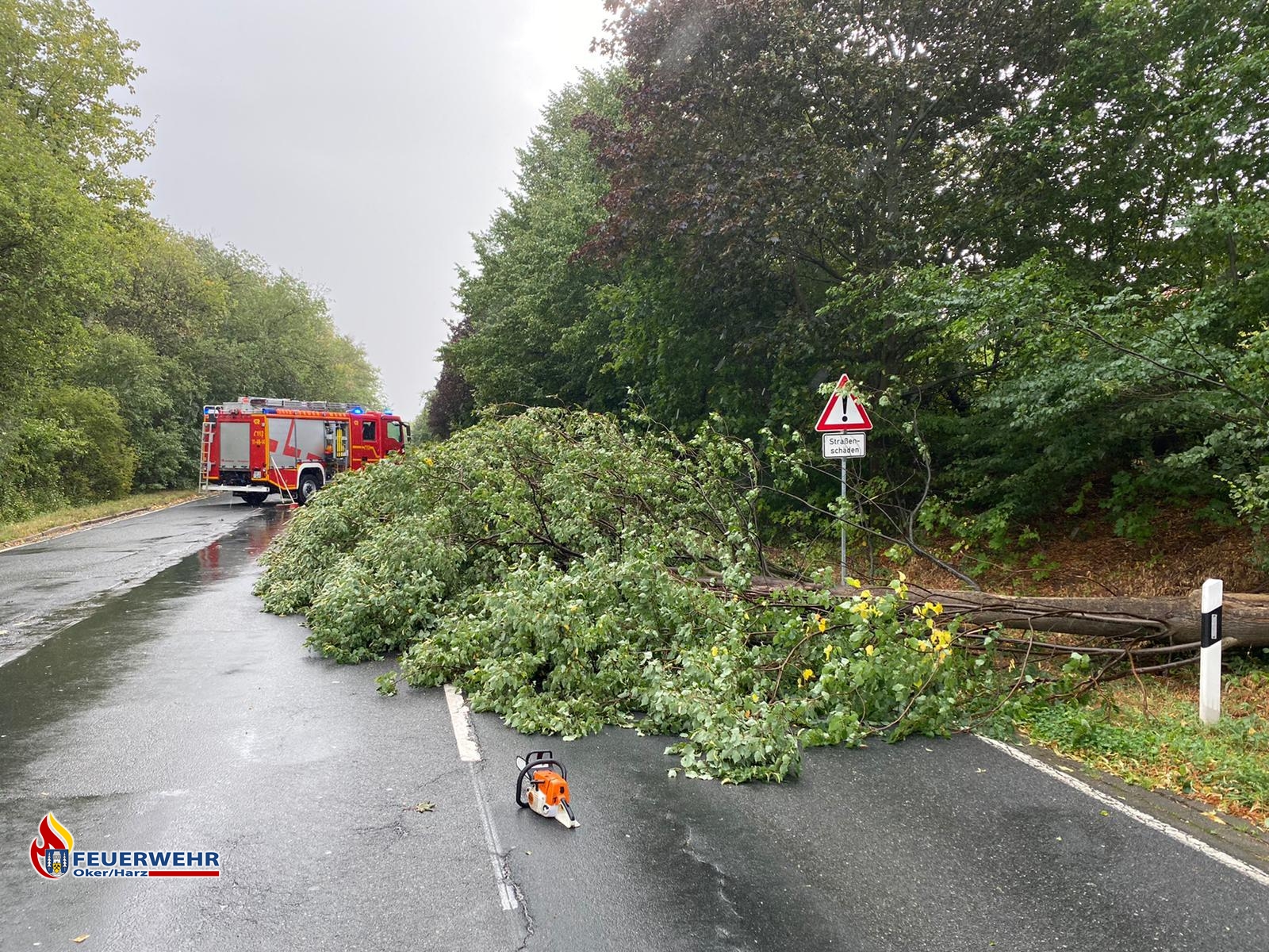 Für die Schneidemaßnahmen wurde die Straße beidseitig gesperrt. Nach rund 20 Minuten war der Baum kleingeschnitten, zur Seite geräumt und die Straße vom gröbsten Dreck befreit. Weitere Aufräumarbeiten übernahmen nun die Mitarbeiter der Stadt Goslar.