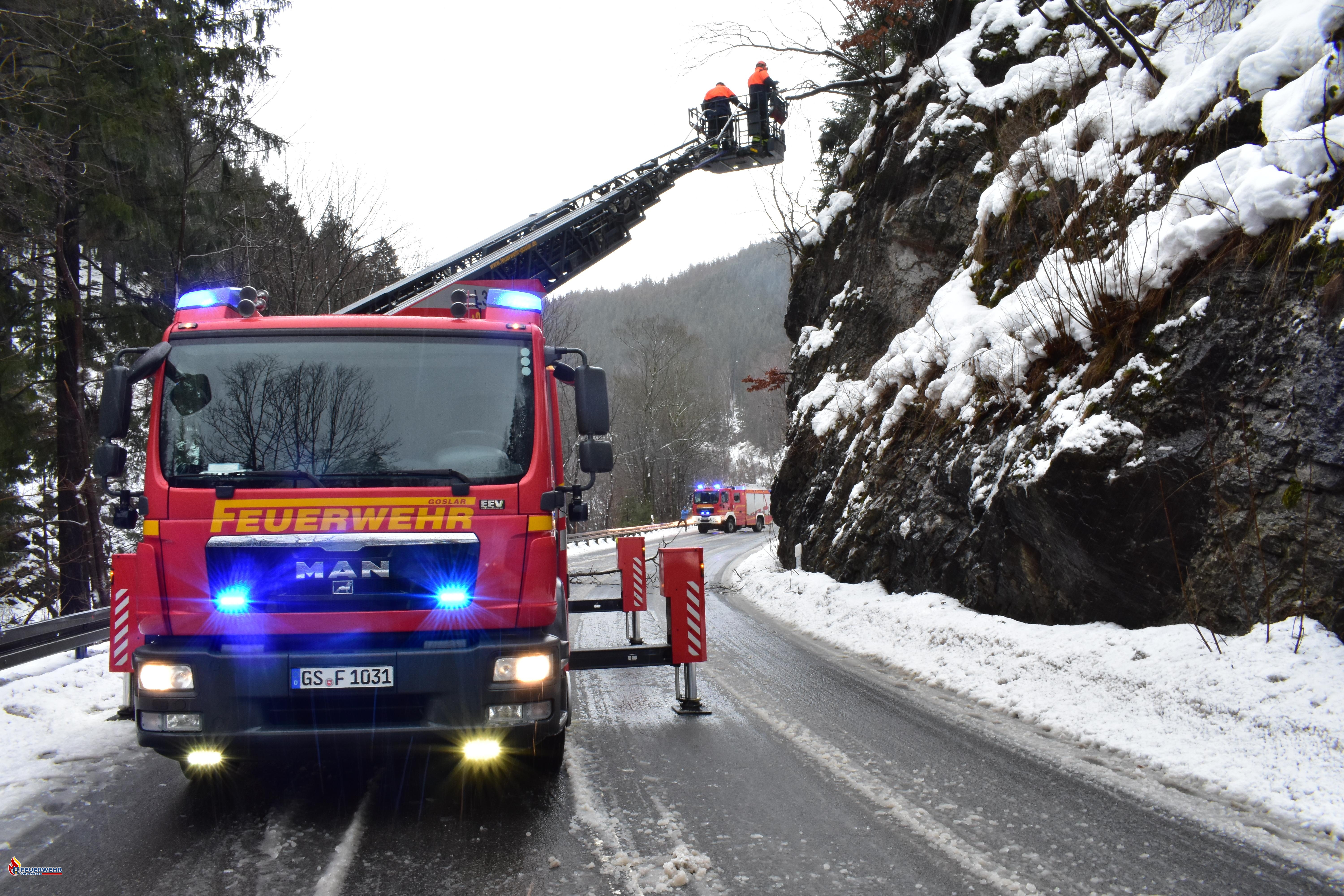 An der Einsatzstelle zwischen der Nachsperre und Romkerhalle machte sich Einsatzleiter Christian Müller, zusammen mit dem Förster, ein Bild von der Lage. Da ein Herankommen an dieser Stelle mit den Aufstellleitern nicht möglich war wurde die Drehleiter der Ortsfeuerwehr Goslar nachalarmiert. Aus dem Korb der Drehleiter heraus konnte die Gefahrenstelle schnell und sicher beseitigt werden. Die Bundesstraße 498 zwischen Oker und Romkerhalle war für den Einsatz eine Stunde voll gesperrt.