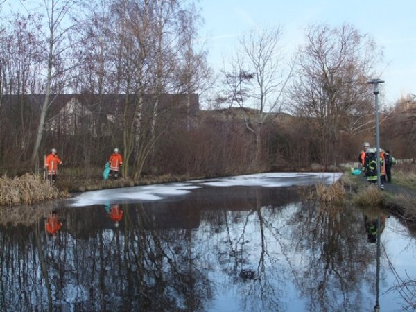 Mitarbeiter der Stadt Goslar, Abteilung Straßen und Grün, entdeckten in einem Teich an dem Fluss Oker in Höhe der Straße Wehrdamm einen Kunststoffkanister. Beim Versuch diesen zu bergen, trat eine ölige Flüssigkeit aus und verbreitete sich auf der Wasseroberfläche. Die daraufhin gegen 9.30 Uhr alarmierte Freiwillige Ortsfeuerwehr Oker streute mit Ölbindemitteln das Gewässer ab. Die mitalarmierte Ortsfeuerwehr Goslar unterstützte mit Ölbindematerial, konnte aber nach kurzer Zeit wieder einrücken. Der Verursacher ist unbekannt, die Polizei nahm die Ermittlungen auf. Eine Spezialfirma nahm das Gemisch zur Entsorgung wieder auf. Einsatzende für die 13 Feuerwehrleute war gegen 10.30 Uhr.