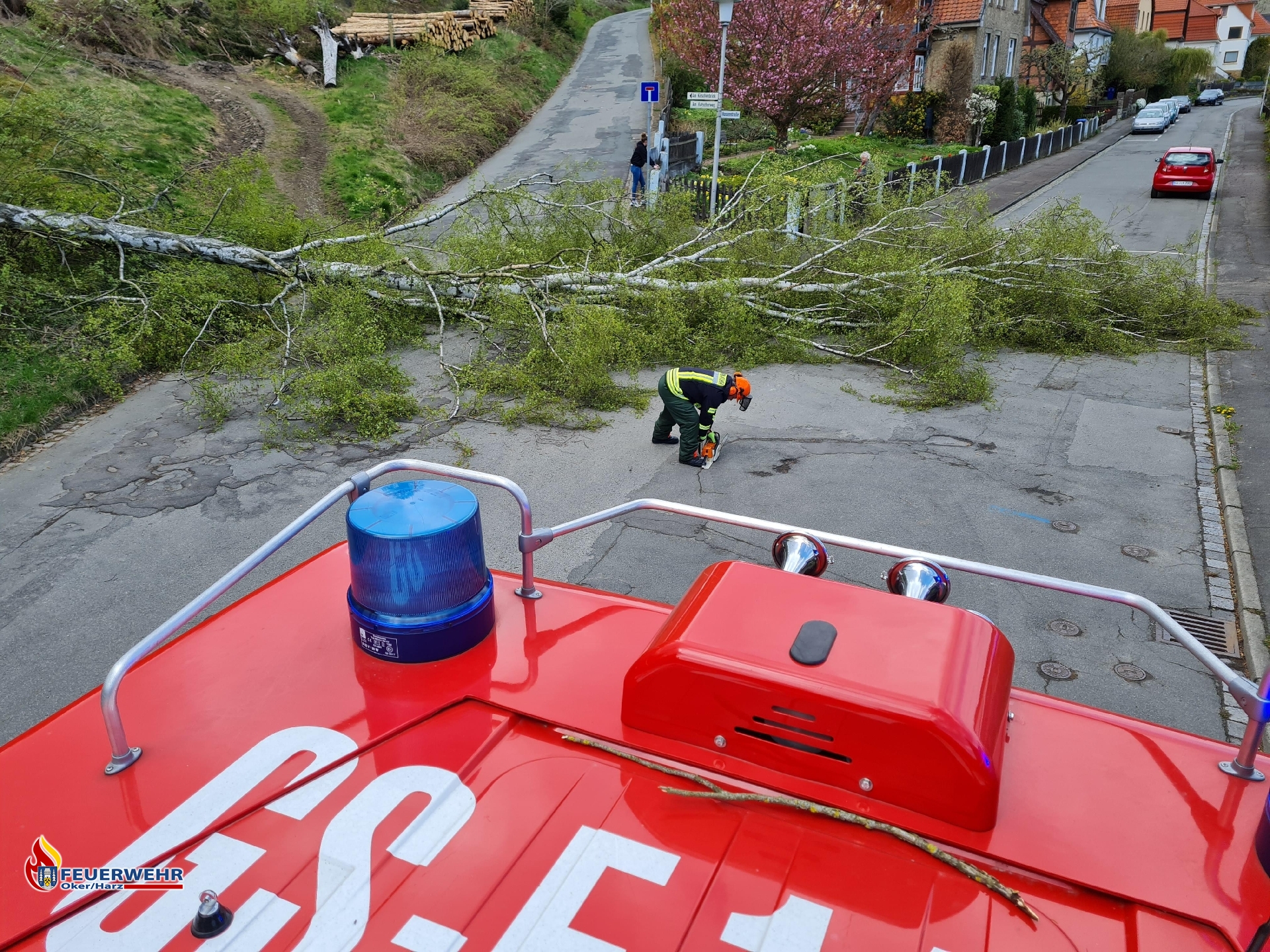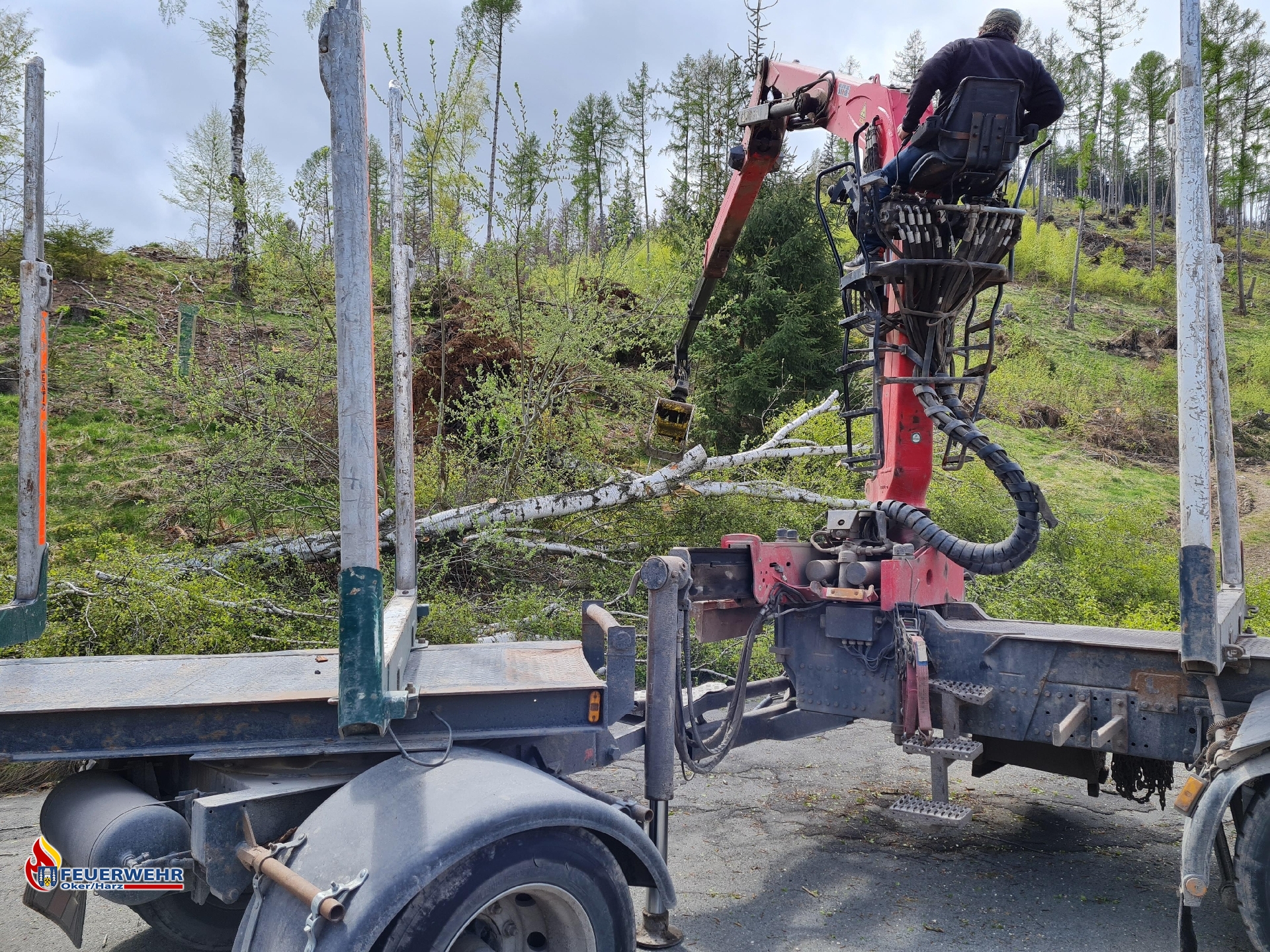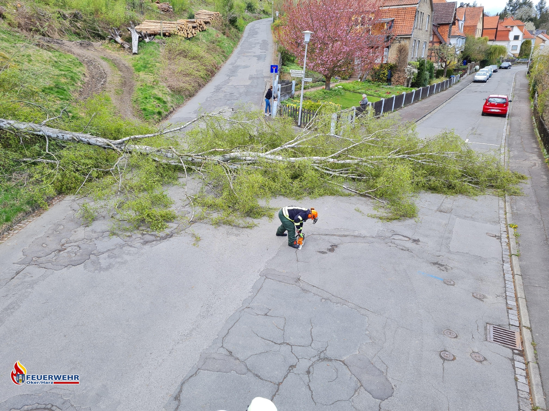 Am Dienstagmittag um 13:32 Uhr wurden wir in die Rosenstraße alarmiert. Dort lag ein Baum auf der Straße, diese war durch den Baum komplett gesperrt. Unsere Einsatzkräfte waren schnell vor Ort und wollten wie immer den Baum mithilfe unserer Kettensäge in kleine Stücke schneiden, um diese an den Straßenrand zu legen. Allerdings lief es diesmal etwas anders, da wir zufällig Hilfe von einem Holztransporter bekamen, der anderes Holz laden wollte. Durch die Hilfe konnten wir größere Stücke schneiden und mithilfe des Krans des Holztransporters wurden die Holzstücke schnell zur Seite gehoben. Im Anschluss haben Kameraden mit Besen und Schaufel die Straße von den Sägespänen und kleinen Ästen befreit.