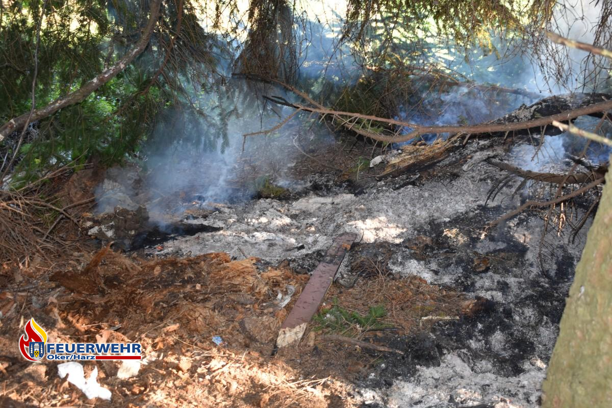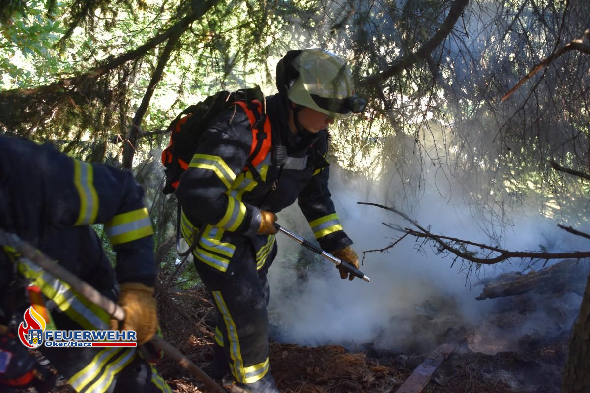 Am Sonntagmorgen wurde der Feuerwehrleitstelle ein Flächenbrand am Waldrand der Adenbergsiedlung in Richtung Göttingerode gemeldet. Um 9.53 Uhr erfolgte die Alarmierung der Ortsfeuerwehr Oker. Das erste Löschfahrzeug lokalisierte, von der Straße "Schrevenwiesen" aus, die Rauchentwicklung am oberen Ende, der bei Okeranern als "Kuhkoppel" bekannten, Wiesenfläche. Zur Erkundung der Zuwegung fuhr zuerst der Ortsbrandmeister Florian Rowold mit dem Mannschaftstransportwagen in den Waldweg. Anschließend wurden die Löschfahrzeuge in den Waldweg geordert. Am Waldrand brannte eine Vegetationsfläche von zirka zehn Quadratmetern. Erste Flammen wurden mit dem Löschrucksack abgelöscht. Für die weiteren Löscharbeiten wurde eine 75 Meter lange Schlauchleitung aufgebaut und die Brandfläche mit zwei D-Strahlrohren abgelöscht. Für die aufwendigen Nachlöscharbeiten wurden einige verbrannte Äste entfernt und der Waldboden umgegraben, so dass keine Glutnester übrig blieben. Nach rund einer Stunde war der Einsatz für die Feuerwehr beendet.