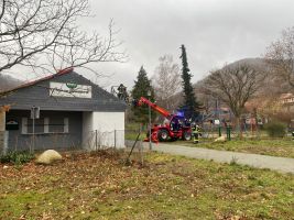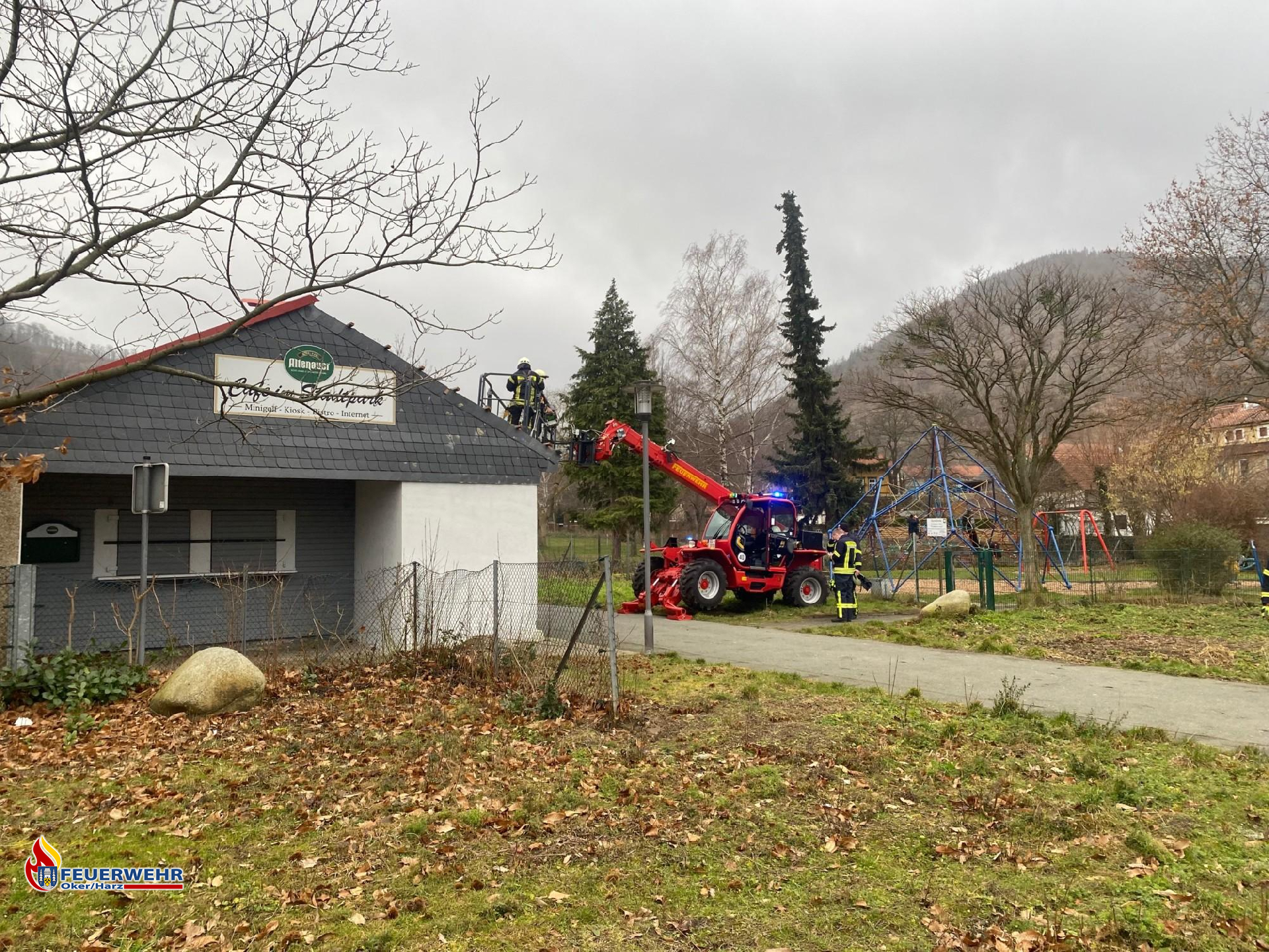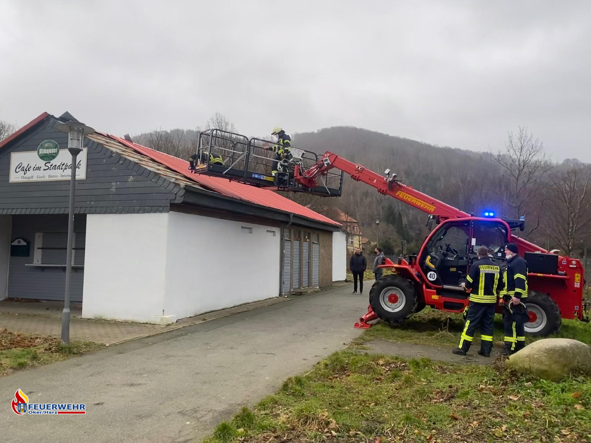Die Vorboten des Sturmtiefs "Nadia" sorgten am frühen Nachmittag für den zweiten Einsatz am heutigen Samstag. Um 12:55 Uhr wurde der Okeraner Ortsbrandmeister telefonisch von der Leitstelle in den Stadtpark alarmiert. Am dortigen Café sollten sich größere Dachteile lösen, welche unkontrolliert abzustürzen drohten. Nach Begutachtung wurde die Kleinalarmgruppe A der Feuerwehr Oker nachalarmiert sowie der Telelader der Feuerwehr Goslar. Aus dem Arbeitskorb des Teleladers konnten die losen Dachteile gesichert bzw. sicher zu Boden gebracht werden.