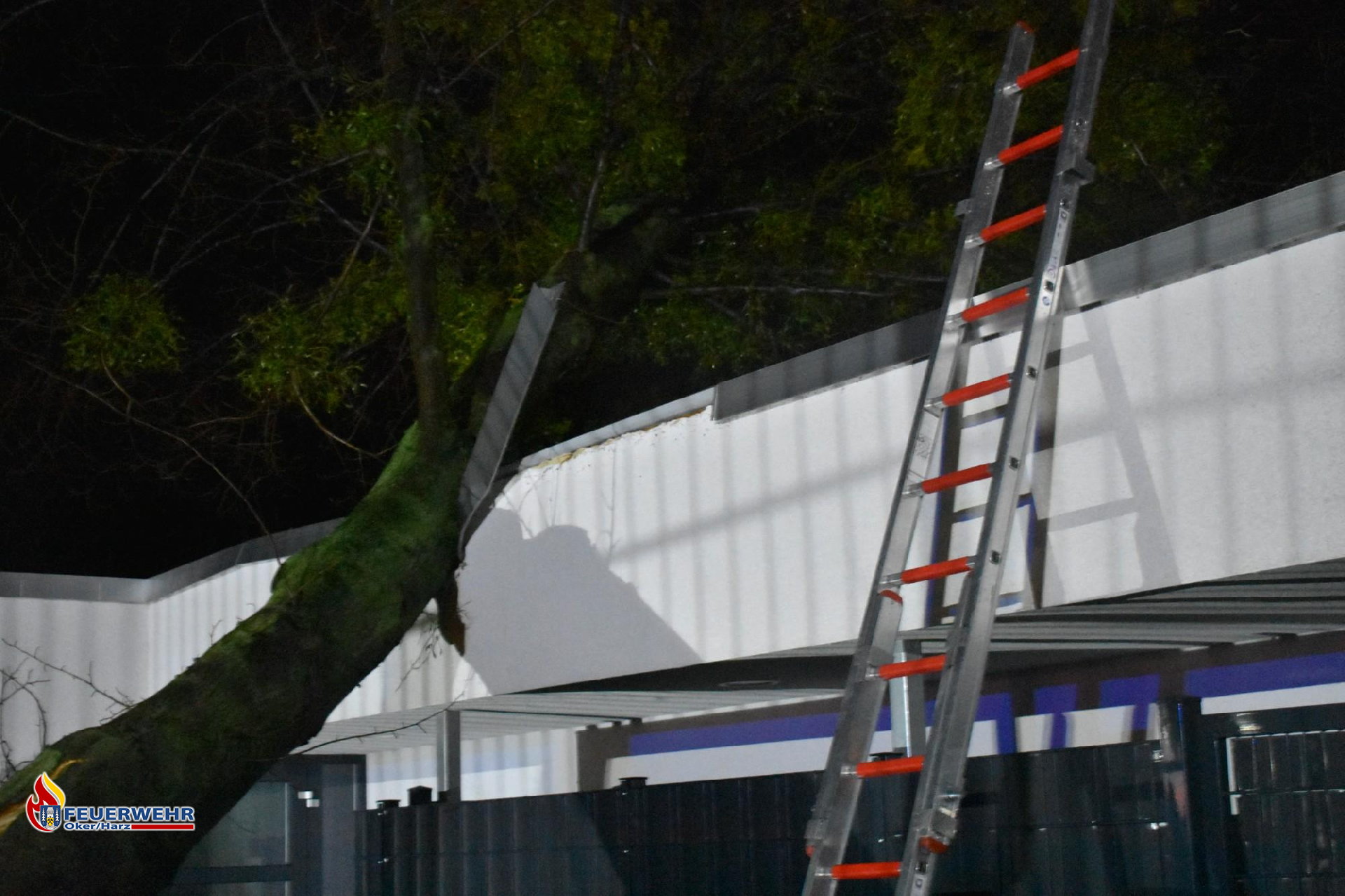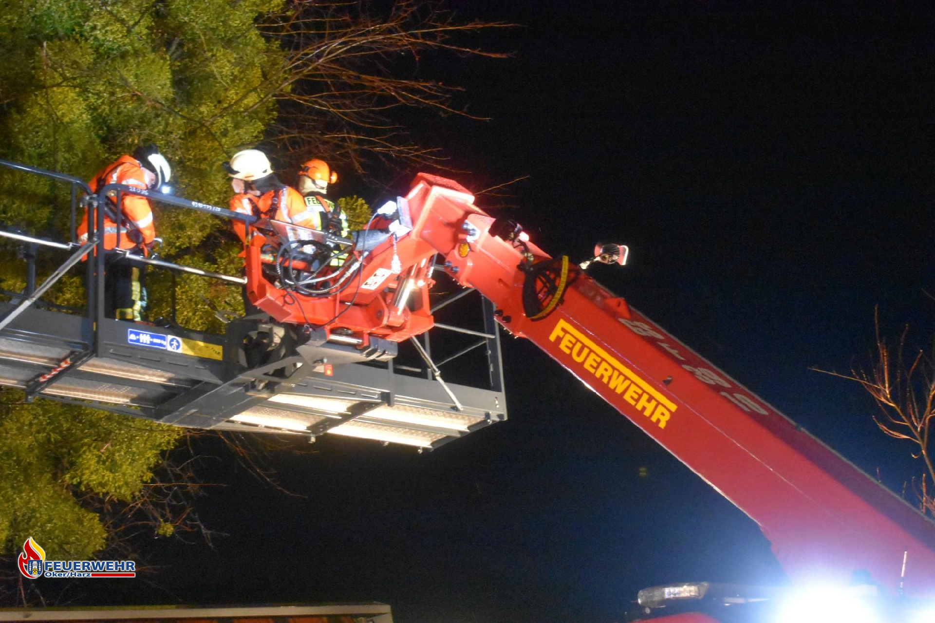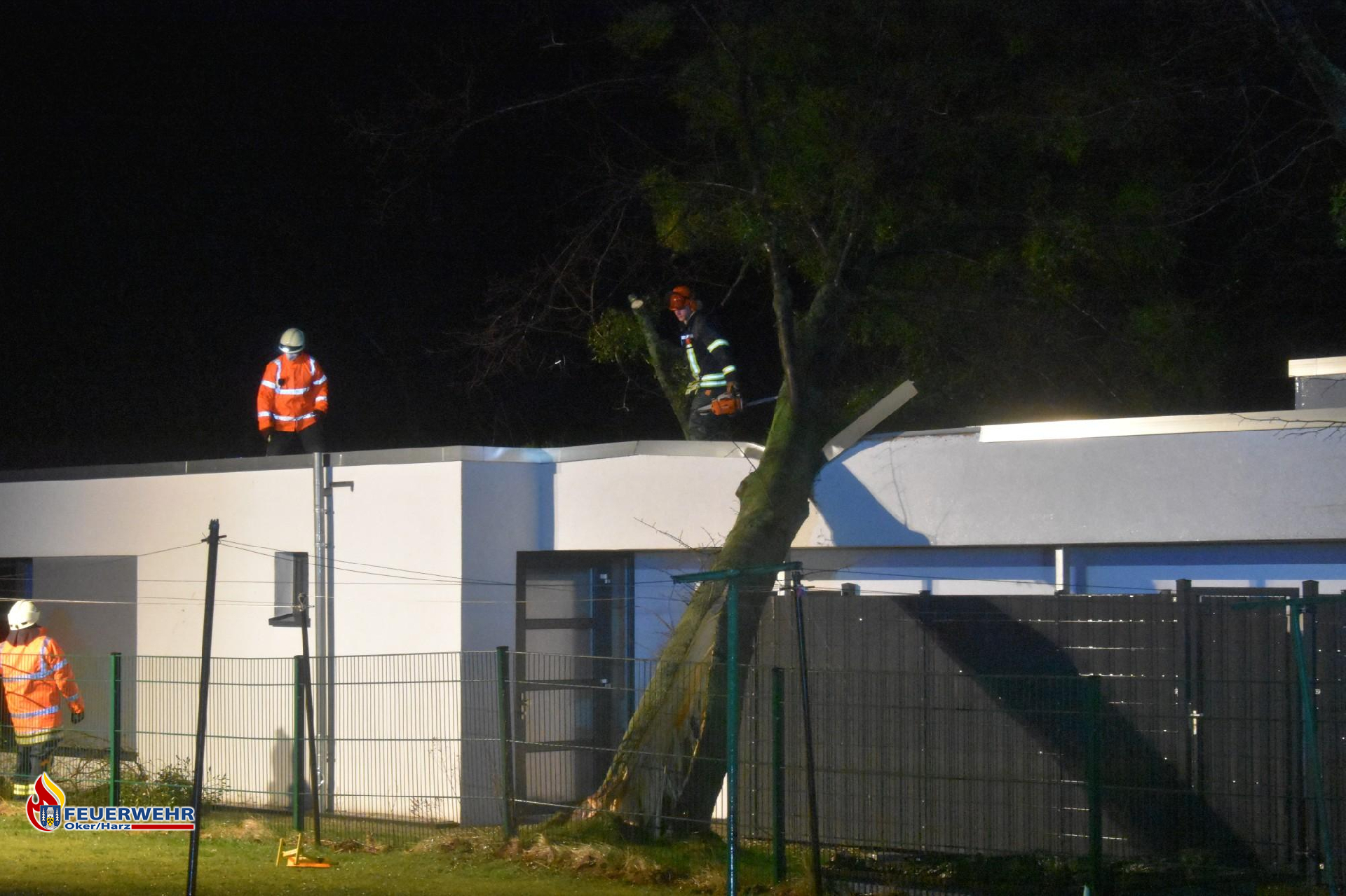 „Baum auf Kindergarten“ so lautete das Einsatzstichwort in der Sonntagnacht um 22:31 Uhr. Unser Ortsbrandmeister kam als erster an der Einsatzstelle an und erkundete die Lage. Er stellte fest, dass ein halb abgeknickter Baum auf dem Dach des Kindergartens lag. Ein Kamerad rüstete sich bereits auf Anfahrt zur Einsatzstelle mit einer Schnittschutzhose aus und ging an der Einsatzstelle direkt zum Baum, um die Situation zu beurteilen. Drei weitere Einsatzkräfte des Löschfahrzeuges, holten eine Mehrzweckleiter sowie die Vierteilige Steckleiter vom Dach des Fahrzeugs und brachten diese in Richtung des Baumes. Der Maschinist brachte den Lichtmast in Stellung, um den Baum zu beleuchten. Währenddessen war das zweite Fahrzeug angekommen und baute aus einer anderen Richtung einen mobilen Lichtmast auf, um den Baum von einer weiteren Seite zu beleuchten.