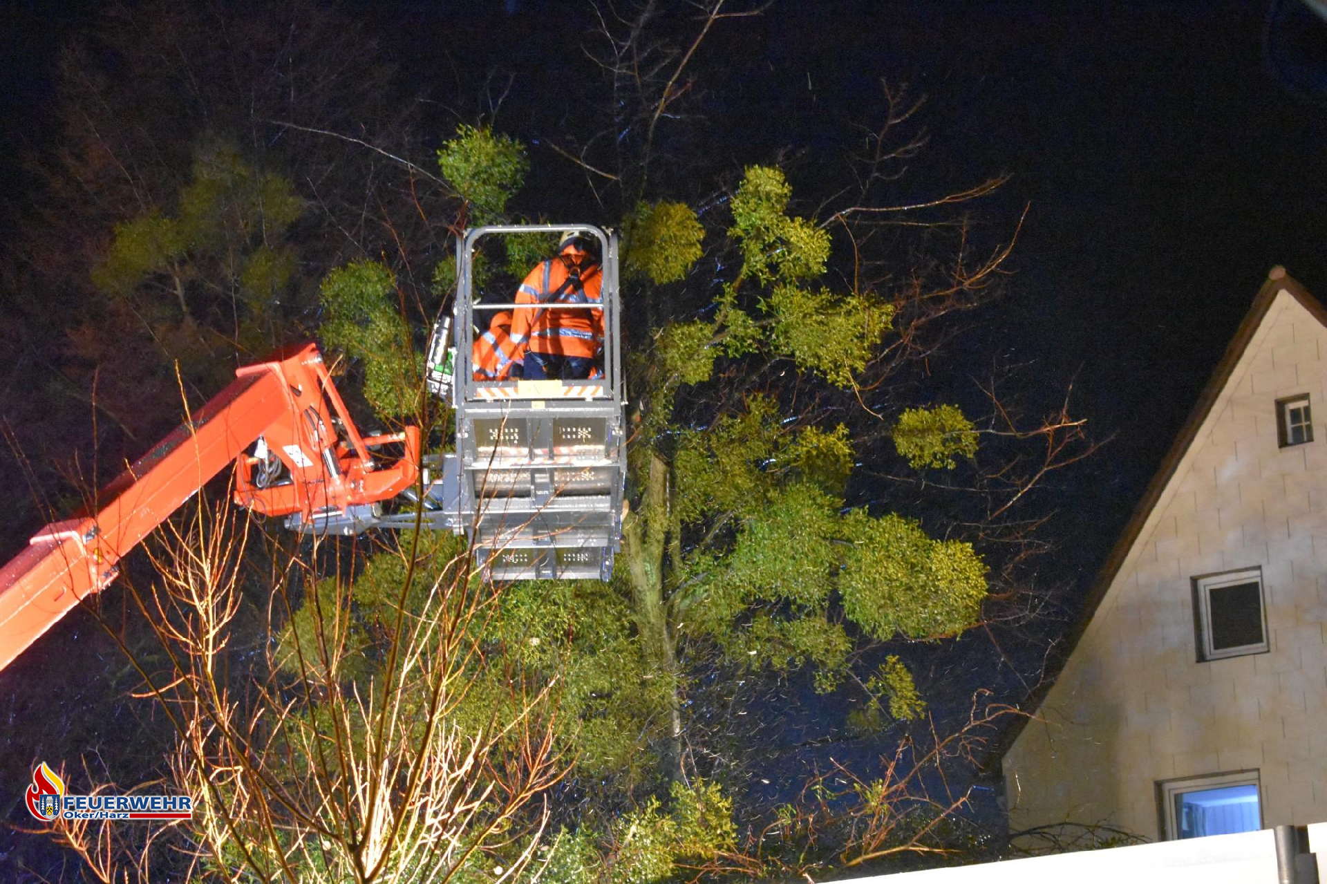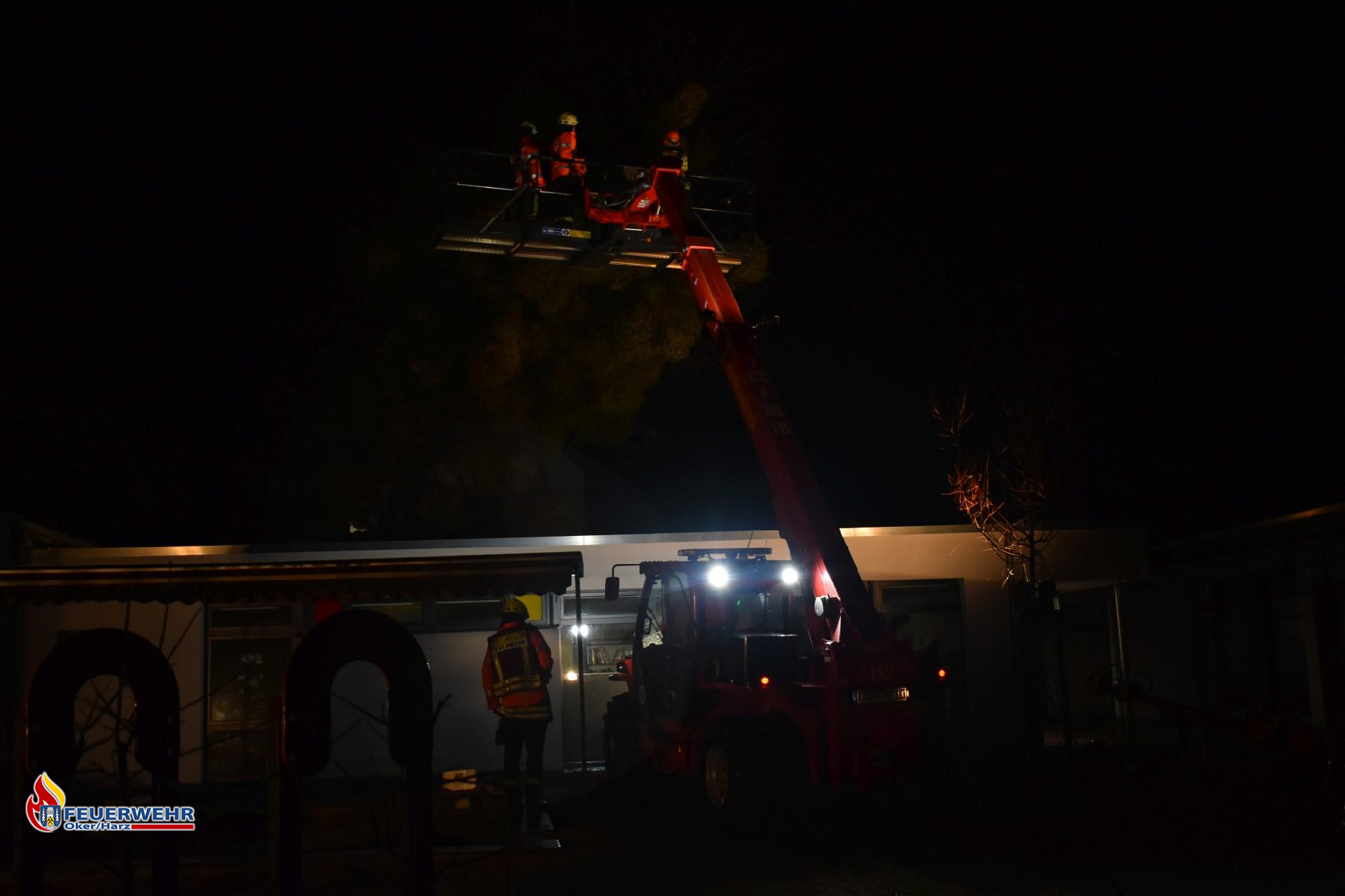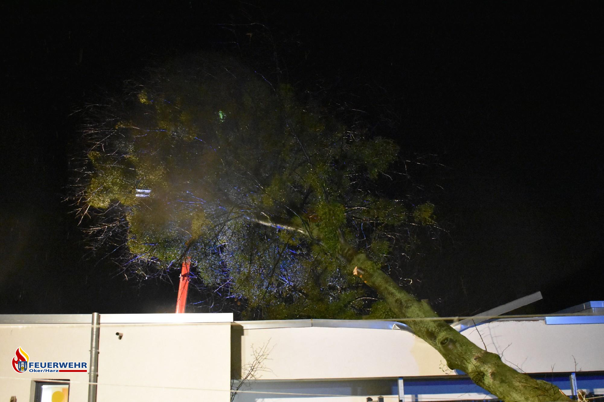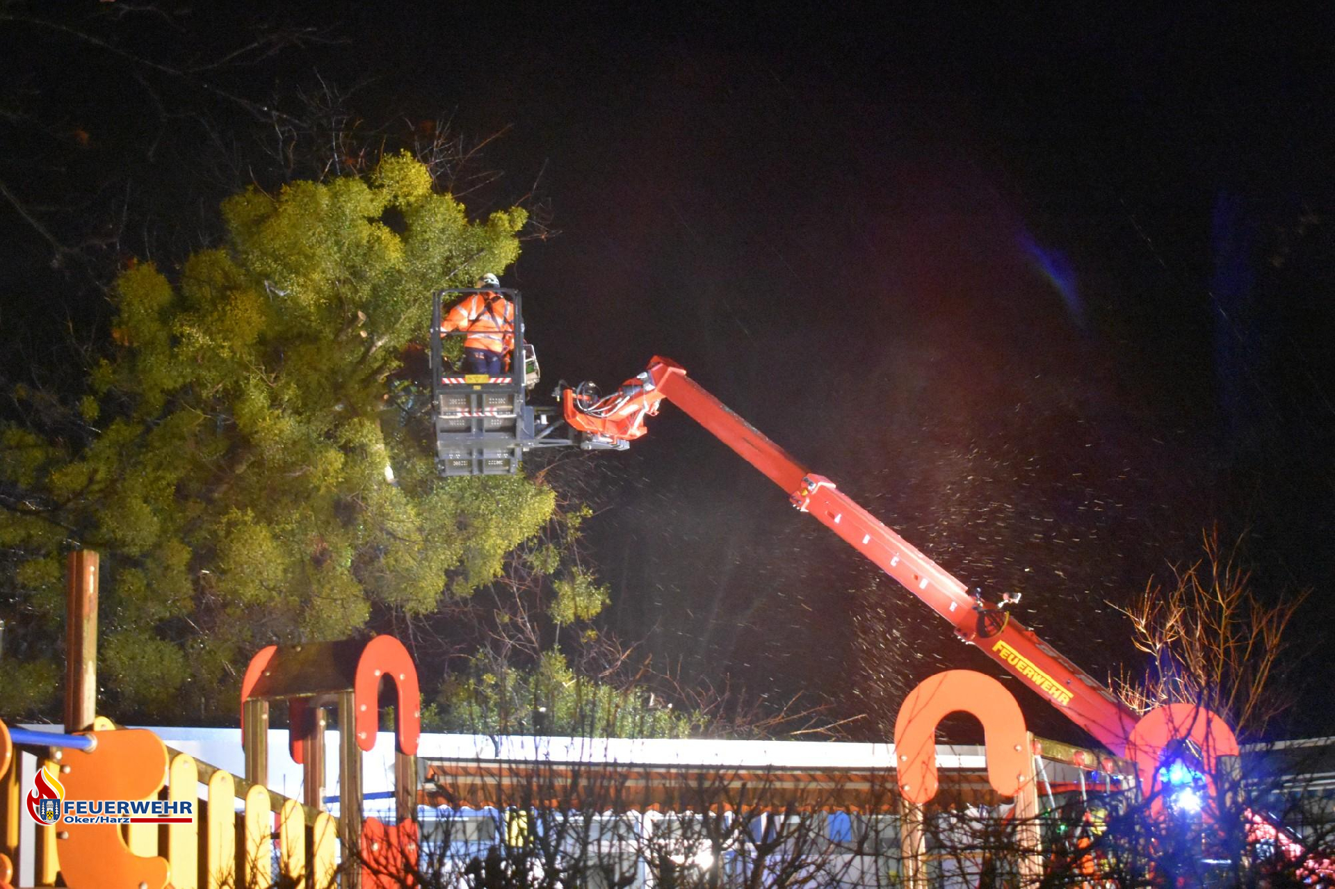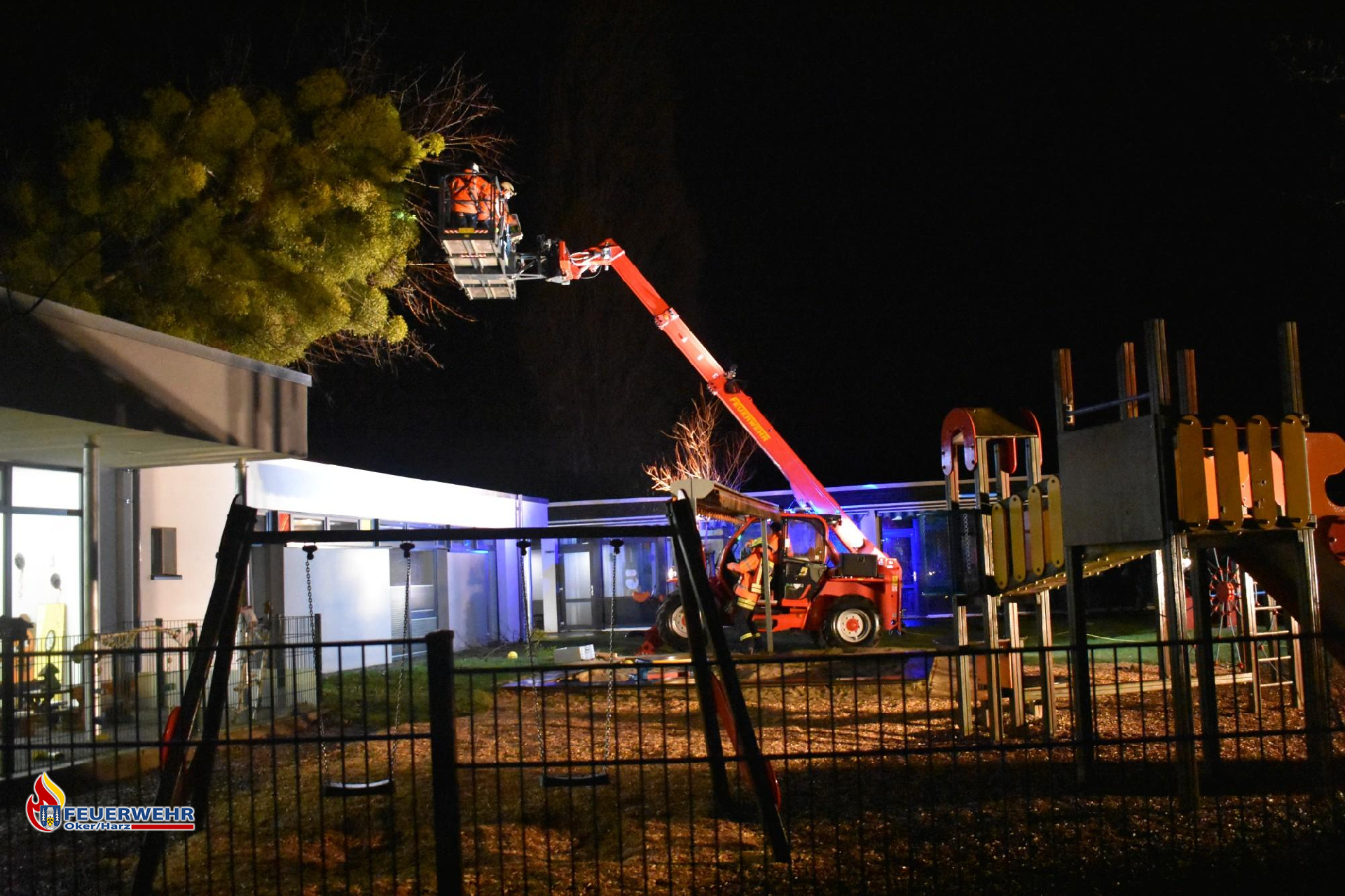 Zwei Einsatzkräfte gingen auf das Dach des Kindergartens und fingen an ein paar Äste des Baums zu entfernen. Schnell wurde klar, dass man bald an die Grenzen, der zur Verfügung stehenden Mittel, kommen würde, sodass der Teleskoplader der Feuerwehr Goslar nachgefordert wurde. Nachdem der Teleskoplader angekommen war, gab es eine kurze Besprechung mit dem Fahrzeugführer. Es wurde ausgemacht, auf das Grundstück des Kindergartens zu fahren. Von dem Grundstück aus und aus einer höheren Position, sollten Äste entfernt werden, um die Windanfälligkeit zu verringern. Da auf dem Kindergartengrundstück kein Licht war, wurden hier ebenfalls zwei mobile Lichtmasten aufgebaut.