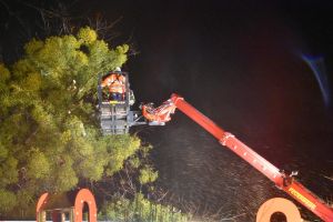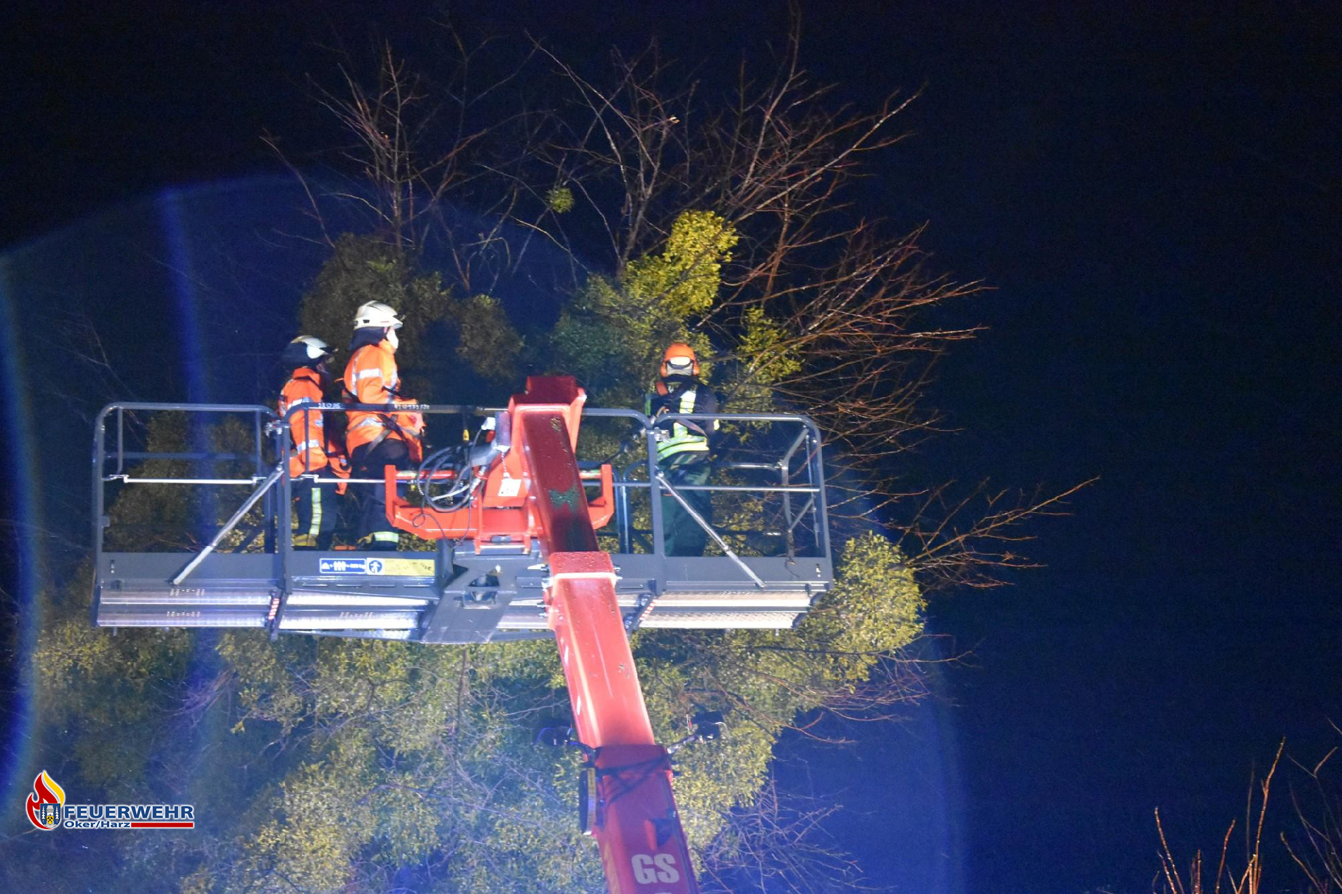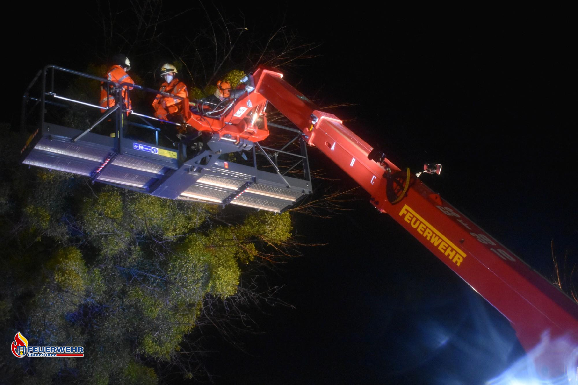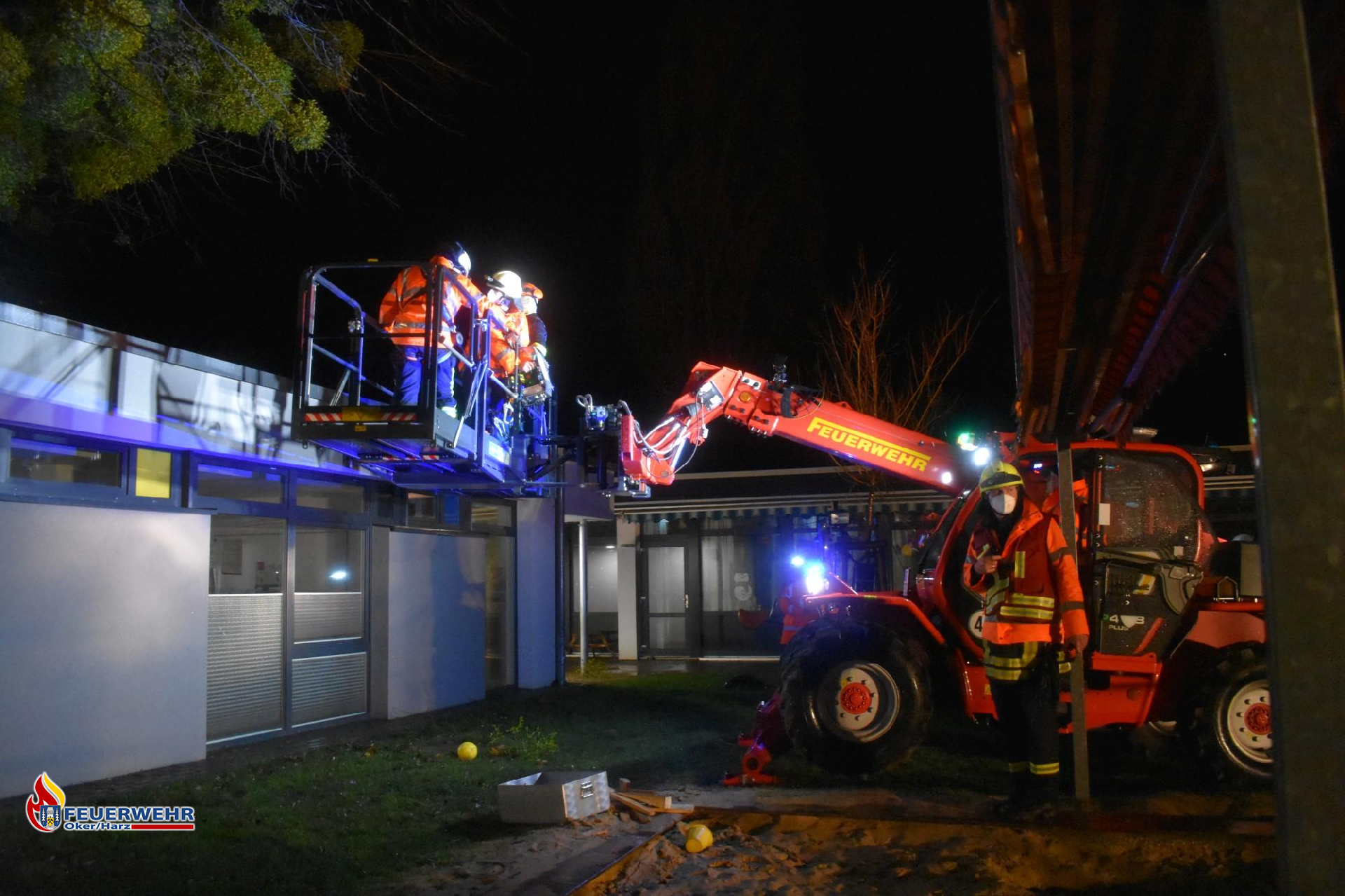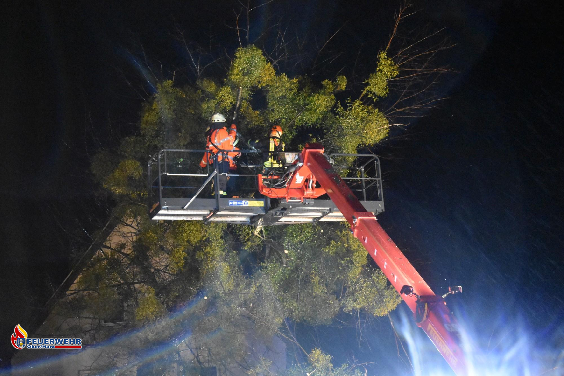 Zwei Einsatzkräfte gingen auf das Dach des Kindergartens und fingen an ein paar Äste des Baums zu entfernen. Schnell wurde klar, dass man bald an die Grenzen, der zur Verfügung stehenden Mittel, kommen würde, sodass der Teleskoplader der Feuerwehr Goslar nachgefordert wurde. Nachdem der Teleskoplader angekommen war, gab es eine kurze Besprechung mit dem Fahrzeugführer. Es wurde ausgemacht, auf das Grundstück des Kindergartens zu fahren. Von dem Grundstück aus und aus einer höheren Position, sollten Äste entfernt werden, um die Windanfälligkeit zu verringern. Da auf dem Kindergartengrundstück kein Licht war, wurden hier ebenfalls zwei mobile Lichtmasten aufgebaut.