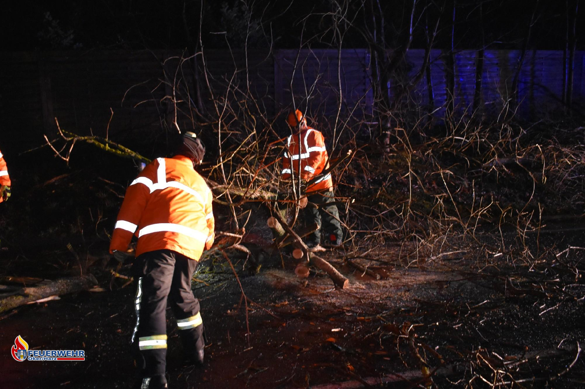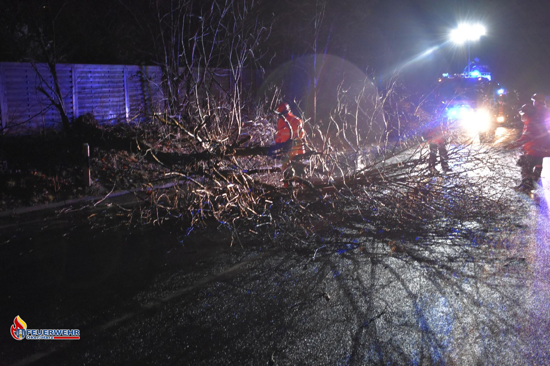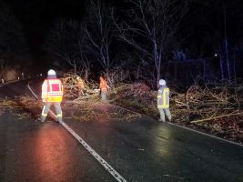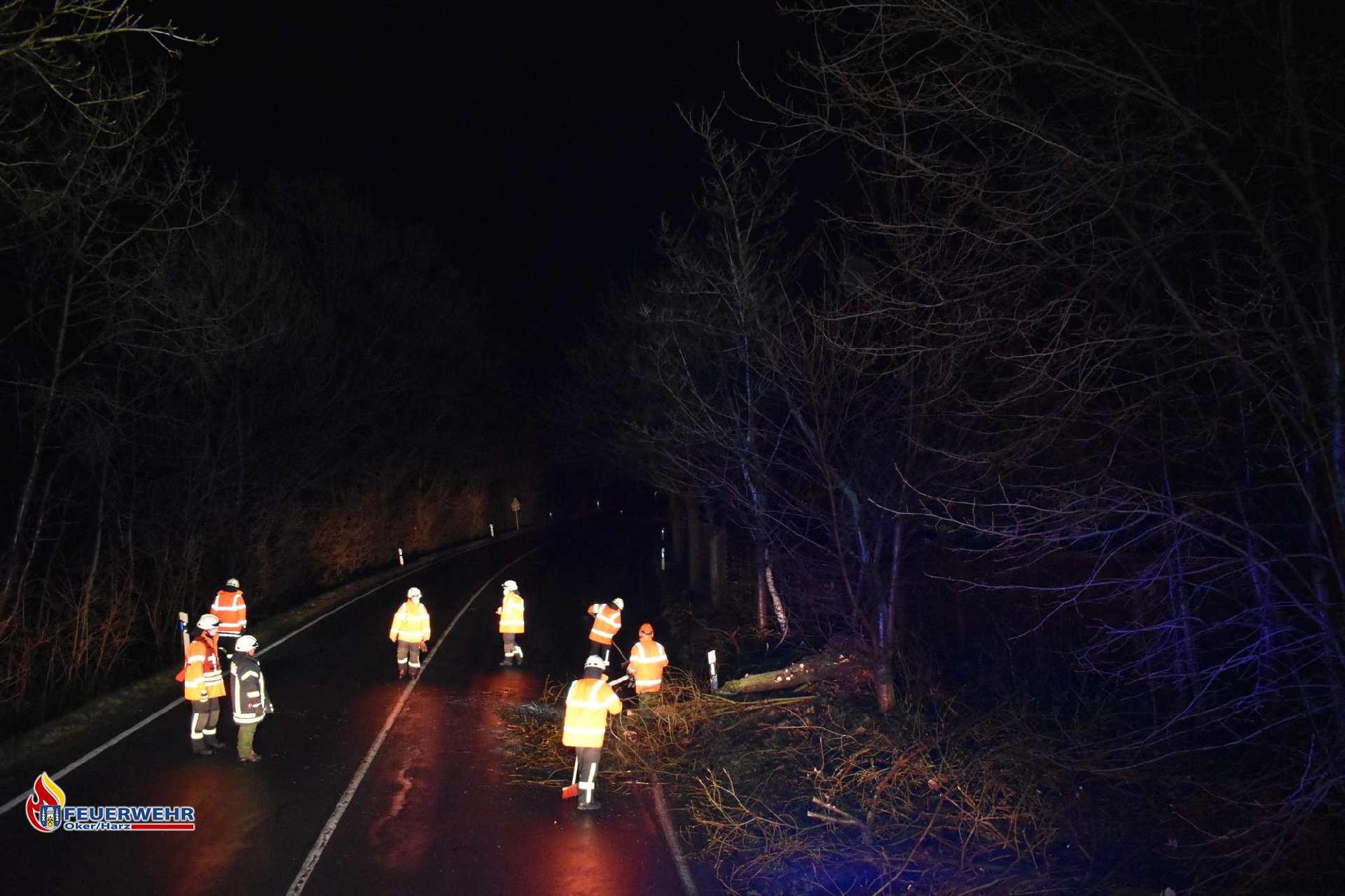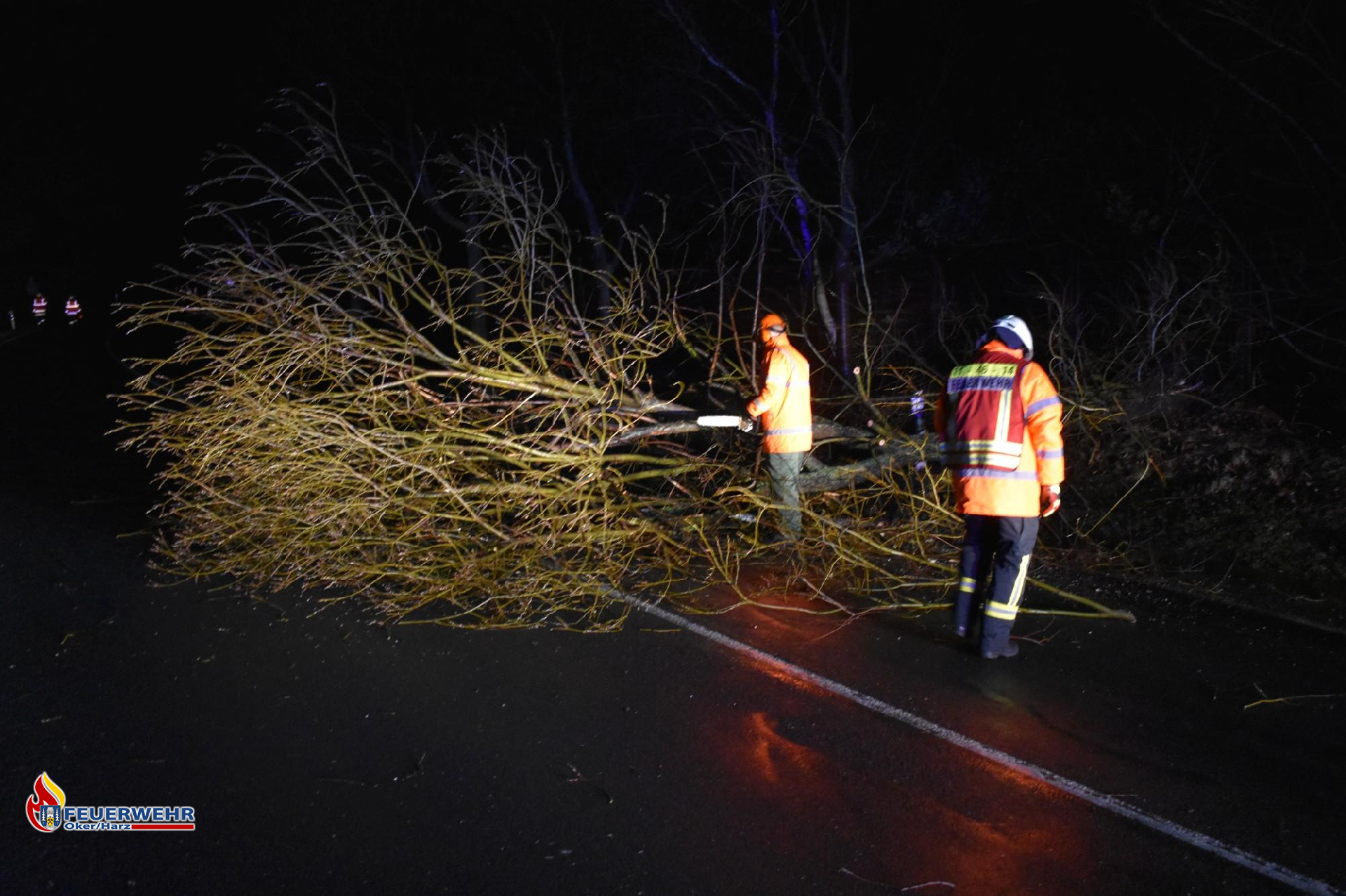 Sturmtief "Antonia" brachte erneut einen Baum auf der L501 zu Fall. Erneut zog sich eine Einsatzkraft die Schnittschutzhose an und brachte an der Einsatzstelle die Motorsäge in Stellung. Zwei weitere Einsatzkräfte kümmerten sich um die Verkehrssicherung, während der Maschinist den Lichtmast des Löschfahrzeuges auf den Baum richtete. Nachdem der Baum zersägt war, wurden Äste an den Straßenrand gelegt und anschließend wurde die Straße mit einem Besen gereinigt. Nach ca. 20 Minuten war der Einsatz beendet.